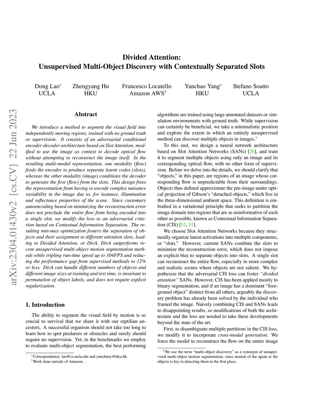 We investigate the emergence of objects in visual perception in the absence of any semantic annotation. The resulting model has received no supervision, does not use any pre-trained features, and yet it can segment the domain of an image into multiple independently moving regions. The resulting motion segmentation method can handle an unknown and varying number of objects in real-time. The core multi-modal conditional encoder-decoder architecture has one modality (optical flow) feed the encoder to produce a collection of latent codes (slots), and the other modality (color image) conditions the decoder to generate the first modality (flow) from the slots. The training criterion is designed to foster ínformation separation' among the slots, while the architecture explicitly allocates activations to individual slots, leading to a method we call Divided Attention (DivA). At test time, DivA handles a different number of objects and different image resolution than seen at training, and is invariant to permutations of the slots. DivA achieves state-of-the-art performance while tripling the runtime speed of comparable methods, up to 104 FPS, and reduces the performance gap from supervised methods to 12% or less. Objects bootstrapped by DivA can then be used to prime static classifiers via contrastive learning. On fewer than 5,000 video clips, training DINO on DivA's object proposals narrows the performance gap to ImageNet-based training by up to 30.2% compared to training directly on the video frames.