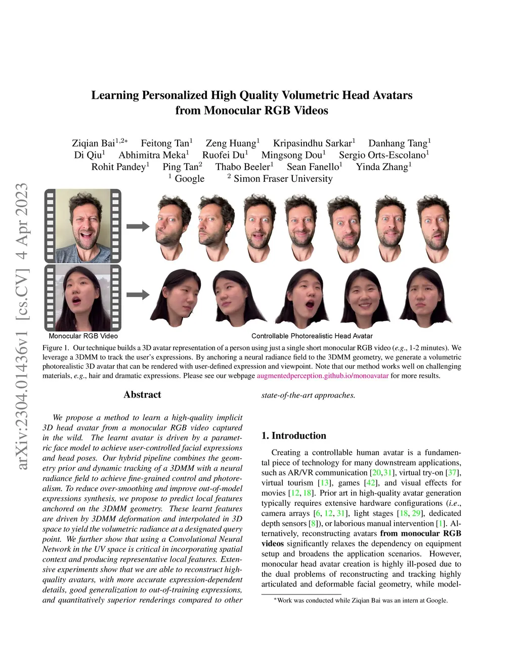 We propose a method to learn a high-quality implicit 3D head avatar from a monocular RGB video captured in the wild. The learnt avatar is driven by a parametric face model to achieve user-controlled facial expressions and head poses. Our hybrid pipeline combines the geometry prior and dynamic tracking of a 3DMM with a neural radiance field to achieve fine-grained control and photorealism. To reduce over-smoothing and improve out-of-model expressions synthesis, we propose to predict local features anchored on the 3DMM geometry. These learnt features are driven by 3DMM deformation and interpolated in 3D space to yield the volumetric radiance at a designated query point. We further show that using a Convolutional Neural Network in the UV space is critical in incorporating spatial context and producing representative local features. Extensive experiments show that we are able to reconstruct high-quality avatars, with more accurate expression-dependent details, good generalization to out-of-training expressions, and quantitatively superior renderings compared to other state-of-the-art approaches.