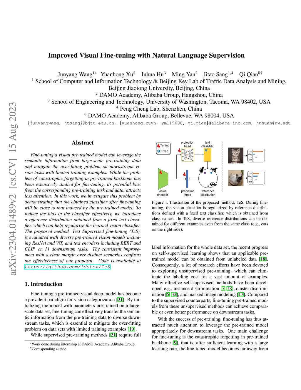 Fine-tuning a visual pre-trained model can leverage the semantic information from large-scale pre-training data and mitigate the over-fitting problem on downstream vision tasks with limited training examples. While the problem of catastrophic forgetting in pre-trained backbone has been extensively studied for fine-tuning, its potential bias from the corresponding pre-training task and data, attracts less attention. In this work, we investigate this problem by demonstrating that the obtained classifier after fine-tuning will be close to that induced by the pre-trained model. To reduce the bias in the classifier effectively, we introduce a reference distribution obtained from a fixed text classifier, which can help regularize the learned vision classifier. The proposed method, Text Supervised fine-tuning (TeS), is evaluated with diverse pre-trained vision models including ResNet and ViT, and text encoders including BERT and CLIP, on 11 downstream tasks. The consistent improvement with a clear margin over distinct scenarios confirms the effectiveness of our proposal. Code is available at \url{https://github.com/idstcv/TeS}.