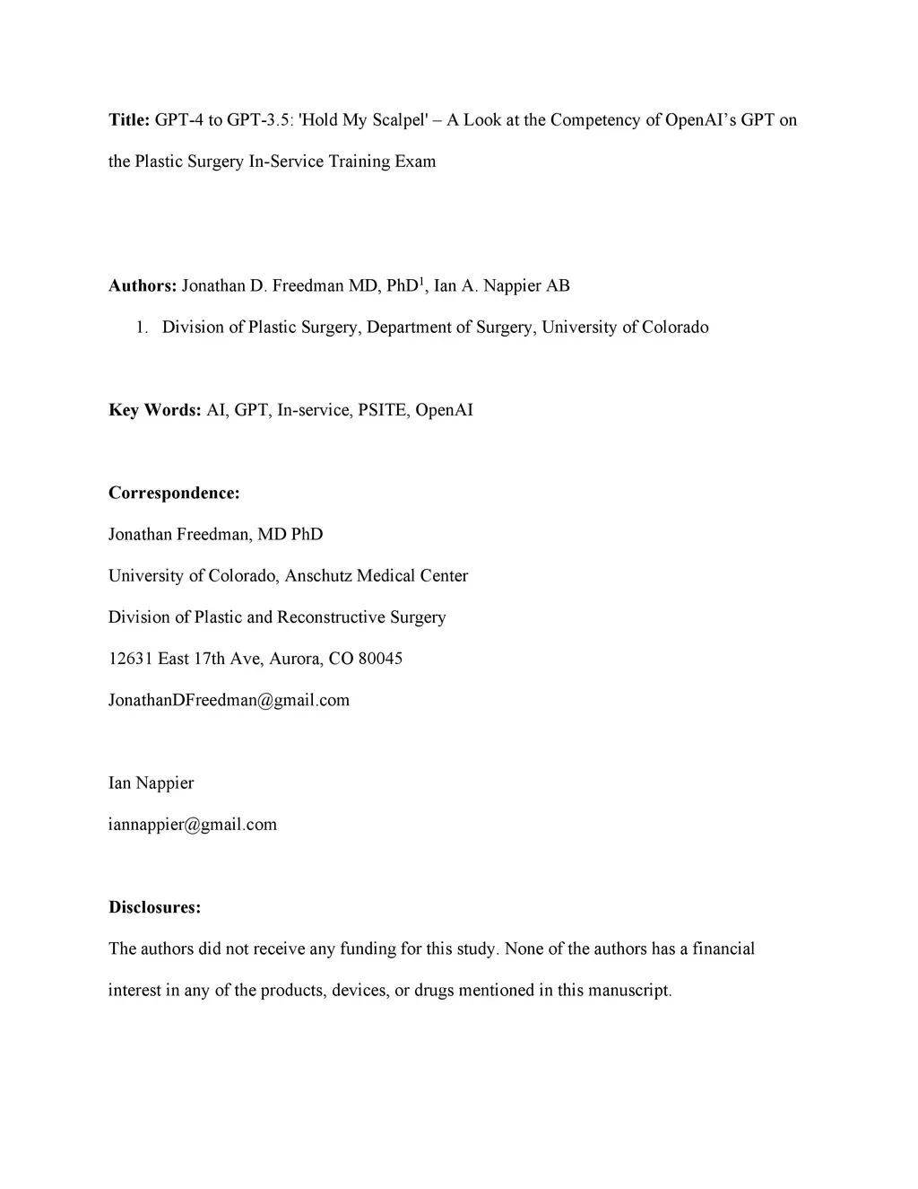 OpenAI's GPT on the Plastic Surgery In-Service Training Exam