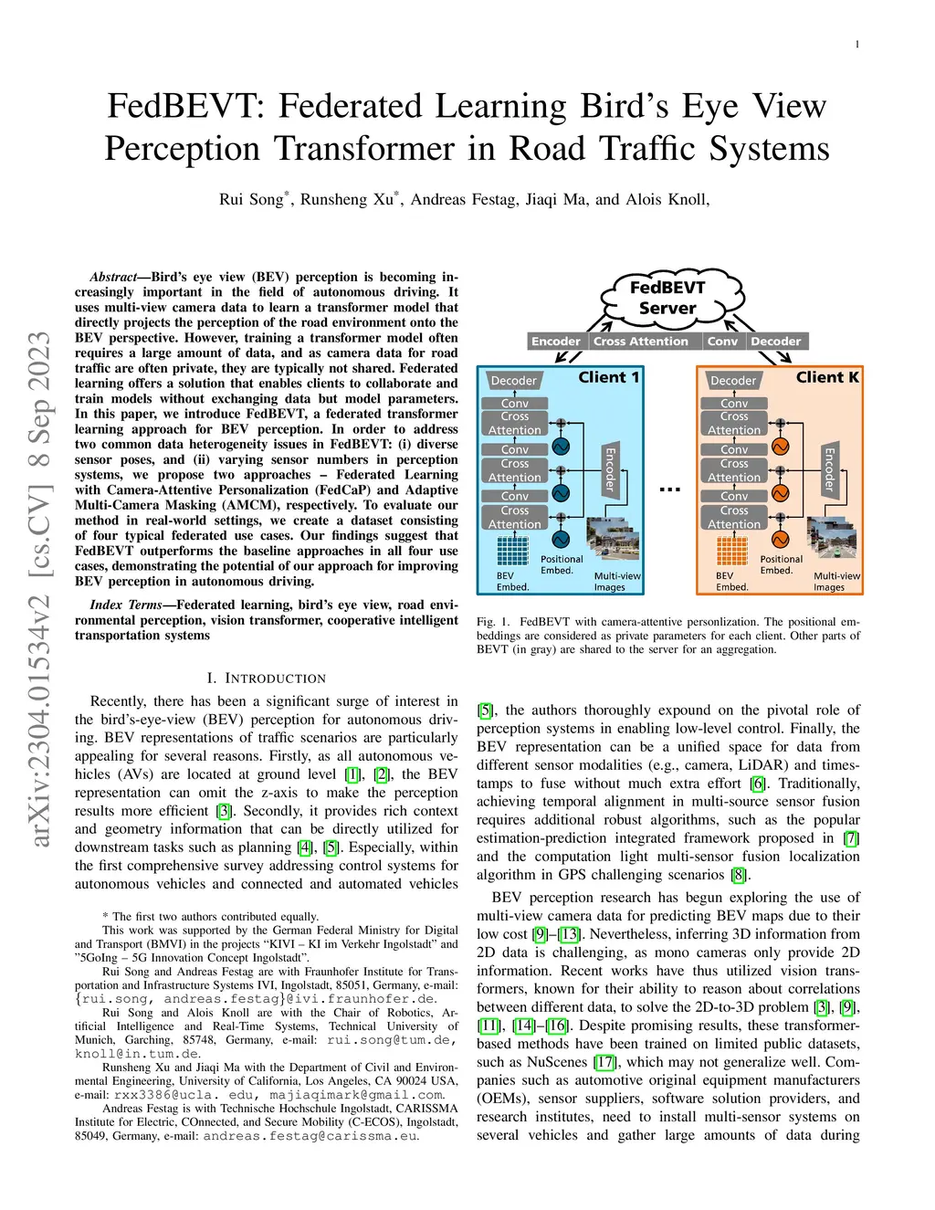 Bird's eye view (BEV) perception is becoming increasingly important in the field of autonomous driving. It uses multi-view camera data to learn a transformer model that directly projects the perception of the road environment onto the BEV perspective. However, training a transformer model often requires a large amount of data, and as camera data for road traffic are often private, they are typically not shared. Federated learning offers a solution that enables clients to collaborate and train models without exchanging data but model parameters. In this paper, we introduce FedBEVT, a federated transformer learning approach for BEV perception. In order to address two common data heterogeneity issues in FedBEVT: (i) diverse sensor poses, and (ii) varying sensor numbers in perception systems, we propose two approaches -- Federated Learning with Camera-Attentive Personalization (FedCaP) and Adaptive Multi-Camera Masking (AMCM), respectively. To evaluate our method in real-world settings, we create a dataset consisting of four typical federated use cases. Our findings suggest that FedBEVT outperforms the baseline approaches in all four use cases, demonstrating the potential of our approach for improving BEV perception in autonomous driving.