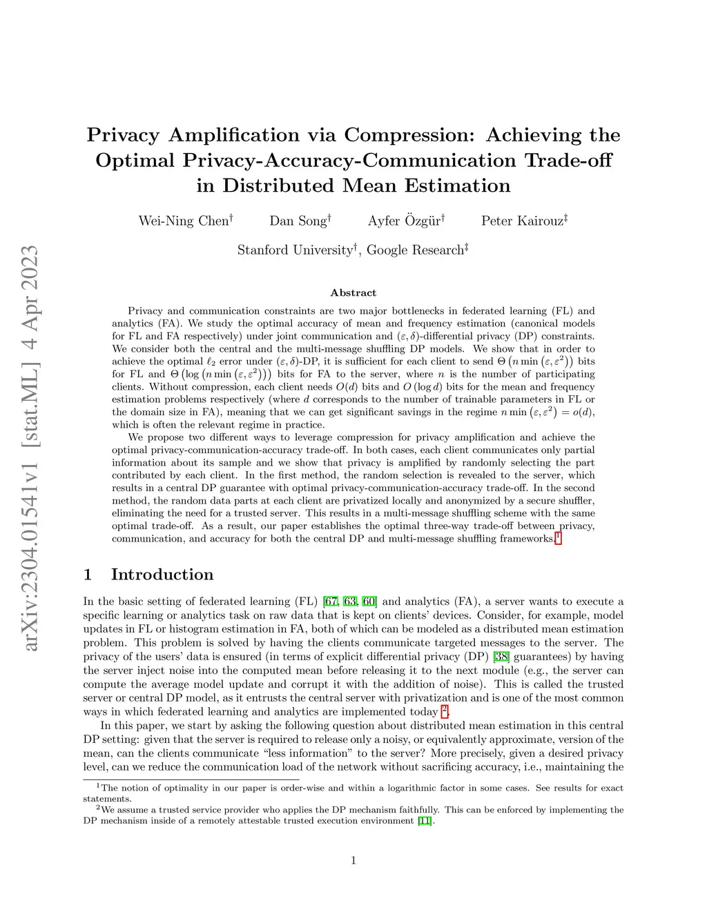 Privacy and communication constraints are two major bottlenecks in federated learning (FL) and analytics (FA). We study the optimal accuracy of mean and frequency estimation (canonical models for FL and FA respectively) under joint communication and -differential privacy (DP) constraints. We show that in order to achieve the optimal error under -DP, it is sufficient for each client to send bits for FL and bits for FA to the server, where is the number of participating clients. Without compression, each client needs bits and bits for the mean and frequency estimation problems respectively (where corresponds to the number of trainable parameters in FL or the domain size in FA), which means that we can get significant savings in the regime $ n \min\left(\varepsilon, \varepsilon^2\right) = o(d)$, which is often the relevant regime in practice. Our algorithms leverage compression for privacy amplification: when each client communicates only partial information about its sample, we show that privacy can be amplified by randomly selecting the part contributed by each client.