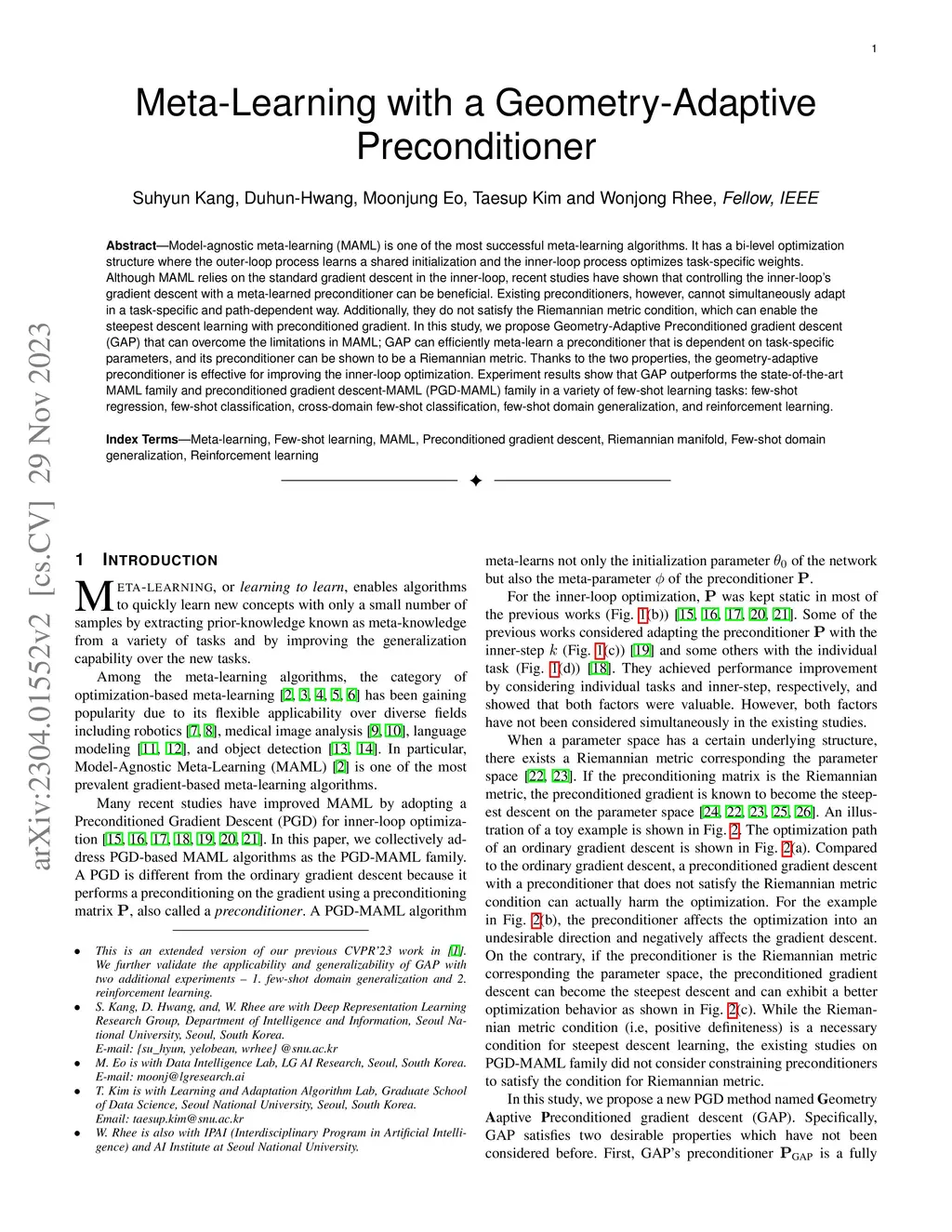 Model-agnostic meta-learning (MAML) is one of the most successful meta-learning algorithms. It has a bi-level optimization structure where the outer-loop process learns a shared initialization and the inner-loop process optimizes task-specific weights. Although MAML relies on the standard gradient descent in the inner-loop, recent studies have shown that controlling the inner-loop's gradient descent with a meta-learned preconditioner can be beneficial. Existing preconditioners, however, cannot simultaneously adapt in a task-specific and path-dependent way. Additionally, they do not satisfy the Riemannian metric condition, which can enable the steepest descent learning with preconditioned gradient. In this study, we propose Geometry-Adaptive Preconditioned gradient descent (GAP) that can overcome the limitations in MAML; GAP can efficiently meta-learn a preconditioner that is dependent on task-specific parameters, and its preconditioner can be shown to be a Riemannian metric. Thanks to the two properties, the geometry-adaptive preconditioner is effective for improving the inner-loop optimization. Experiment results show that GAP outperforms the state-of-the-art MAML family and preconditioned gradient descent-MAML (PGD-MAML) family in a variety of few-shot learning tasks. Code is available at: https://github.com/Suhyun777/CVPR23-GAP.