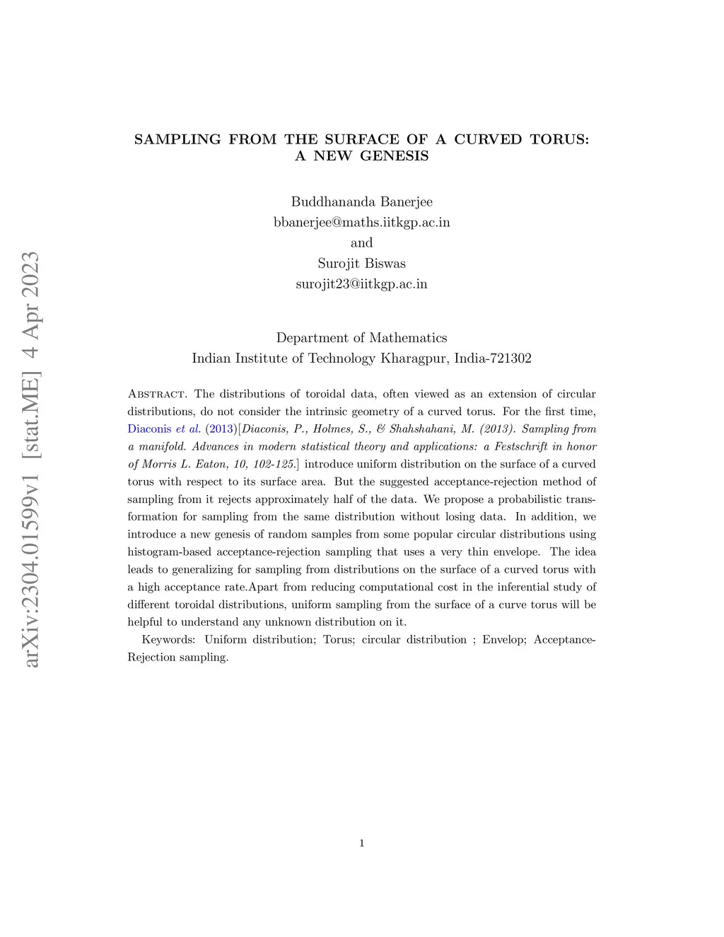 The distributions of toroidal data, often viewed as an extension of circular distributions, do not consider the intrinsic geometry of a curved torus. For the first time, Diaconis et al. (2013)[Diaconis, P., Holmes, S., & Shahshahani, M. (2013). Sampling from a manifold. Advances in modern statistical theory and applications: a Festschrift in honor of Morris L. Eaton, 10, 102-125.] introduce uniform distribution on the surface of a curved torus with respect to its surface area. But the suggested acceptance-rejection method of sampling from it rejects approximately half of the data. We propose a probabilistic transformation for sampling from the same distribution without losing data. In addition, we introduce a new genesis of random samples from some popular circular distributions using histogram-based acceptance-rejection sampling that uses a very thin envelope. The idea leads to generalizing for sampling from distributions on the surface of a curved torus with a high acceptance rate.Apart from reducing computational cost in the inferential study of different toroidal distributions, uniform sampling from the surface of a curve torus will be helpful to understand any unknown distribution on it.