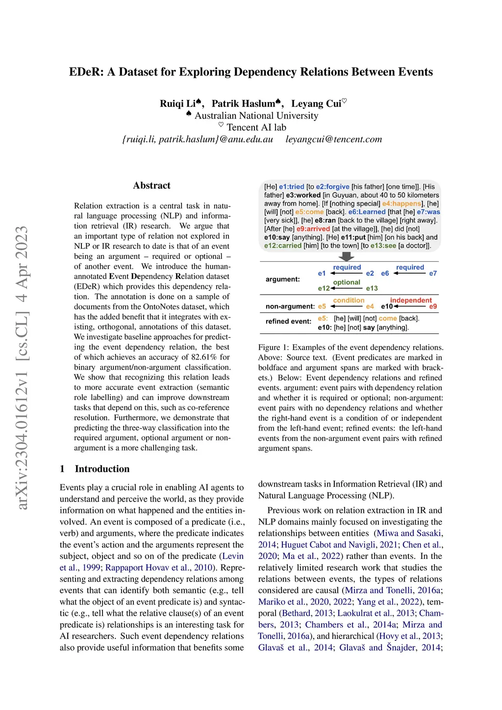 Relation extraction is a central task in natural language processing (NLP) and information retrieval (IR) research. We argue that an important type of relation not explored in NLP or IR research to date is that of an event being an argument - required or optional - of another event. We introduce the human-annotated Event Dependency Relation dataset (EDeR) which provides this dependency relation. The annotation is done on a sample of documents from the OntoNotes dataset, which has the added benefit that it integrates with existing, orthogonal, annotations of this dataset. We investigate baseline approaches for predicting the event dependency relation, the best of which achieves an accuracy of 82.61 for binary argument/non-argument classification. We show that recognizing this relation leads to more accurate event extraction (semantic role labelling) and can improve downstream tasks that depend on this, such as co-reference resolution. Furthermore, we demonstrate that predicting the three-way classification into the required argument, optional argument or non-argument is a more challenging task.