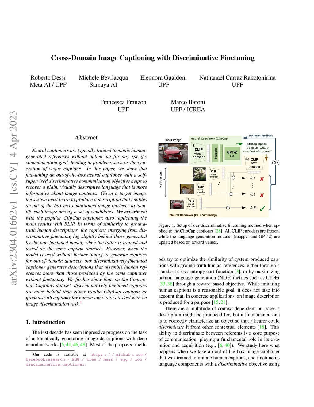 Neural captioners are typically trained to mimic human-generated references without optimizing for any specific communication goal, leading to problems such as the generation of vague captions. In this paper, we show that fine-tuning an out-of-the-box neural captioner with a self-supervised discriminative communication objective helps to recover a plain, visually descriptive language that is more informative about image contents. Given a target image, the system must learn to produce a description that enables an out-of-the-box text-conditioned image retriever to identify such image among a set of candidates. We experiment with the popular ClipCap captioner, also replicating the main results with BLIP. In terms of similarity to ground-truth human descriptions, the captions emerging from discriminative finetuning lag slightly behind those generated by the non-finetuned model, when the latter is trained and tested on the same caption dataset. However, when the model is used without further tuning to generate captions for out-of-domain datasets, our discriminatively-finetuned captioner generates descriptions that resemble human references more than those produced by the same captioner without finetuning. We further show that, on the Conceptual Captions dataset, discriminatively finetuned captions are more helpful than either vanilla ClipCap captions or ground-truth captions for human annotators tasked with an image discrimination task.
