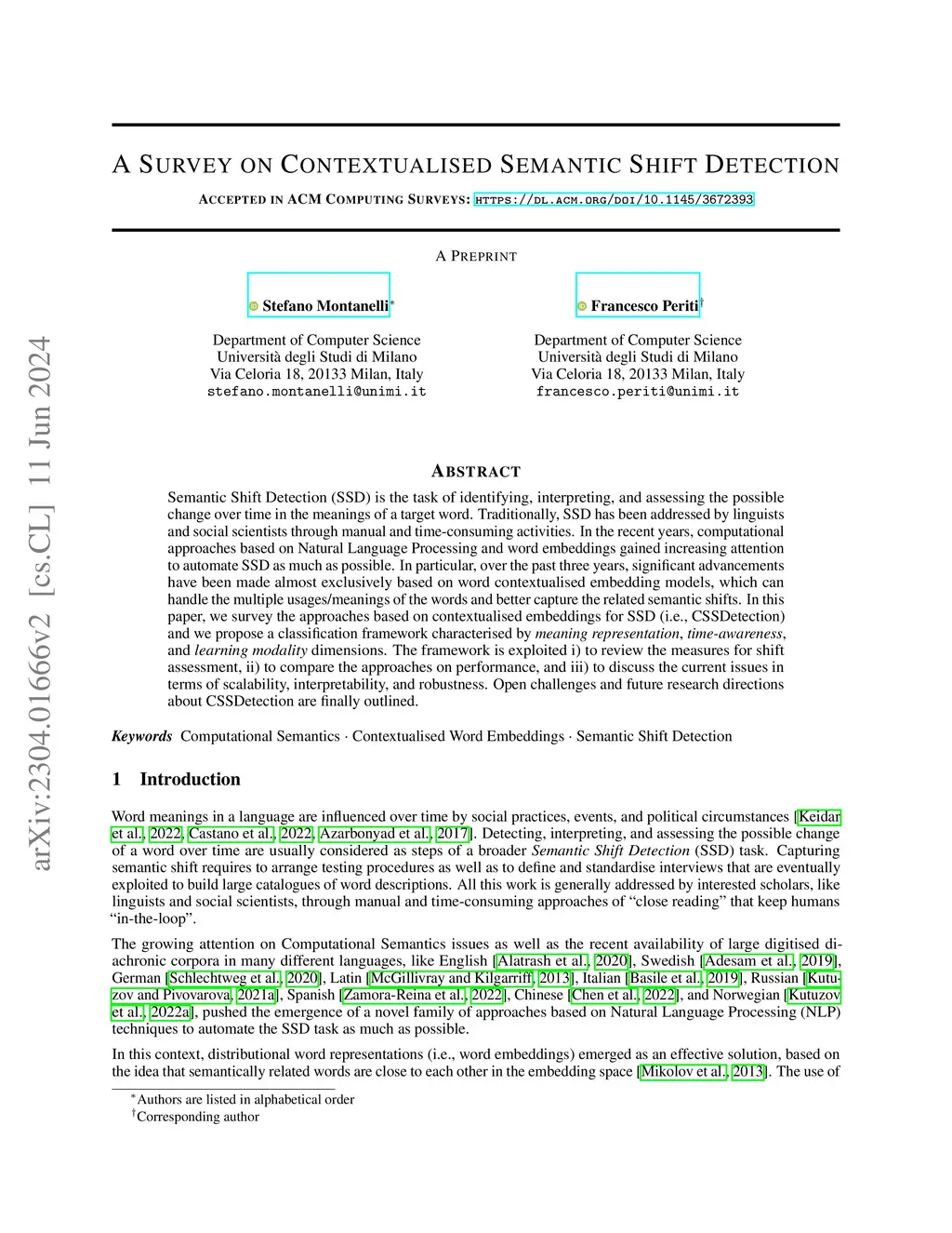 Semantic Shift Detection (SSD) is the task of identifying, interpreting, and assessing the possible change over time in the meanings of a target word. Traditionally, SSD has been addressed by linguists and social scientists through manual and time-consuming activities. In the recent years, computational approaches based on Natural Language Processing and word embeddings gained increasing attention to automate SSD as much as possible. In particular, over the past three years, significant advancements have been made almost exclusively based on word contextualised embedding models, which can handle the multiple usages/meanings of the words and better capture the related semantic shifts. In this paper, we survey the approaches based on contextualised embeddings for SSD (i.e., CSSDetection) and we propose a classification framework characterised by meaning representation, time-awareness, and learning modality dimensions. The framework is exploited i) to review the measures for shift assessment, ii) to compare the approaches on performance, and iii) to discuss the current issues in terms of scalability, interpretability, and robustness. Open challenges and future research directions about CSSDetection are finally outlined.