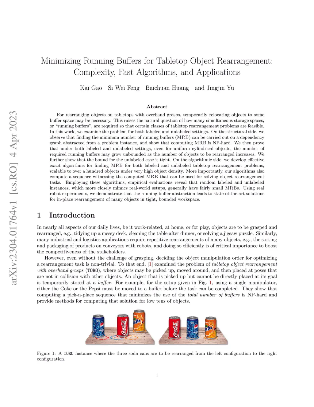 Minimizing Running Buffers for Tabletop Object Rearrangement: