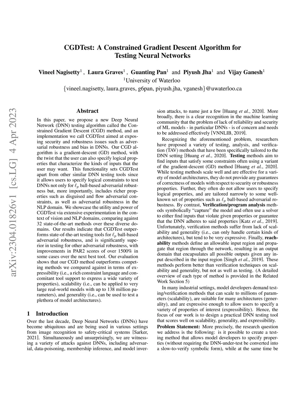 In this paper, we propose a new Deep Neural Network (DNN) testing algorithm called the Constrained Gradient Descent (CGD) method, and an implementation we call CGDTest aimed at exposing security and robustness issues such as adversarial robustness and bias in DNNs. Our CGD algorithm is a gradient-descent (GD) method, with the twist that the user can also specify logical properties that characterize the kinds of inputs that the user may want. This functionality sets CGDTest apart from other similar DNN testing tools since it allows users to specify logical constraints to test DNNs not only for ball-based adversarial robustness but, more importantly, includes richer properties such as disguised and flow adversarial constraints, as well as adversarial robustness in the NLP domain. We showcase the utility and power of CGDTest via extensive experimentation in the context of vision and NLP domains, comparing against 32 state-of-the-art methods over these diverse domains. Our results indicate that CGDTest outperforms state-of-the-art testing tools for ball-based adversarial robustness, and is significantly superior in testing for other adversarial robustness, with improvements in PAR2 scores of over 1500% in some cases over the next best tool. Our evaluation shows that our CGD method outperforms competing methods we compared against in terms of expressibility (i.e., a rich constraint language and concomitant tool support to express a wide variety of properties), scalability (i.e., can be applied to very large real-world models with up to 138 million parameters), and generality (i.e., can be used to test a plethora of model architectures).