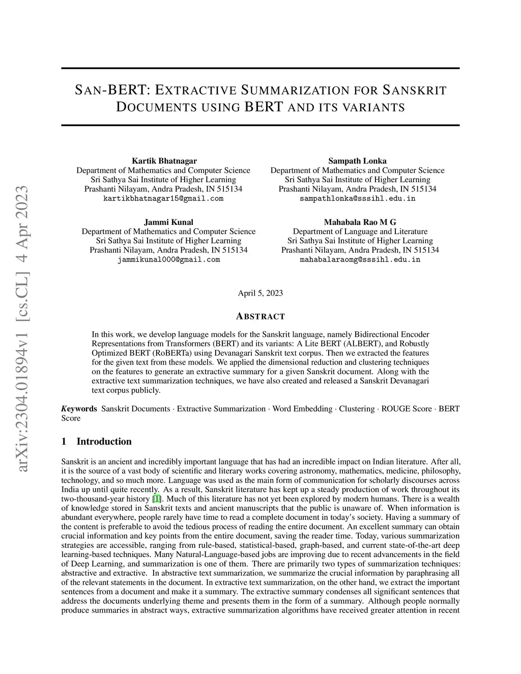 San-BERT: Extractive Summarization for Sanskrit Documents using BERT and