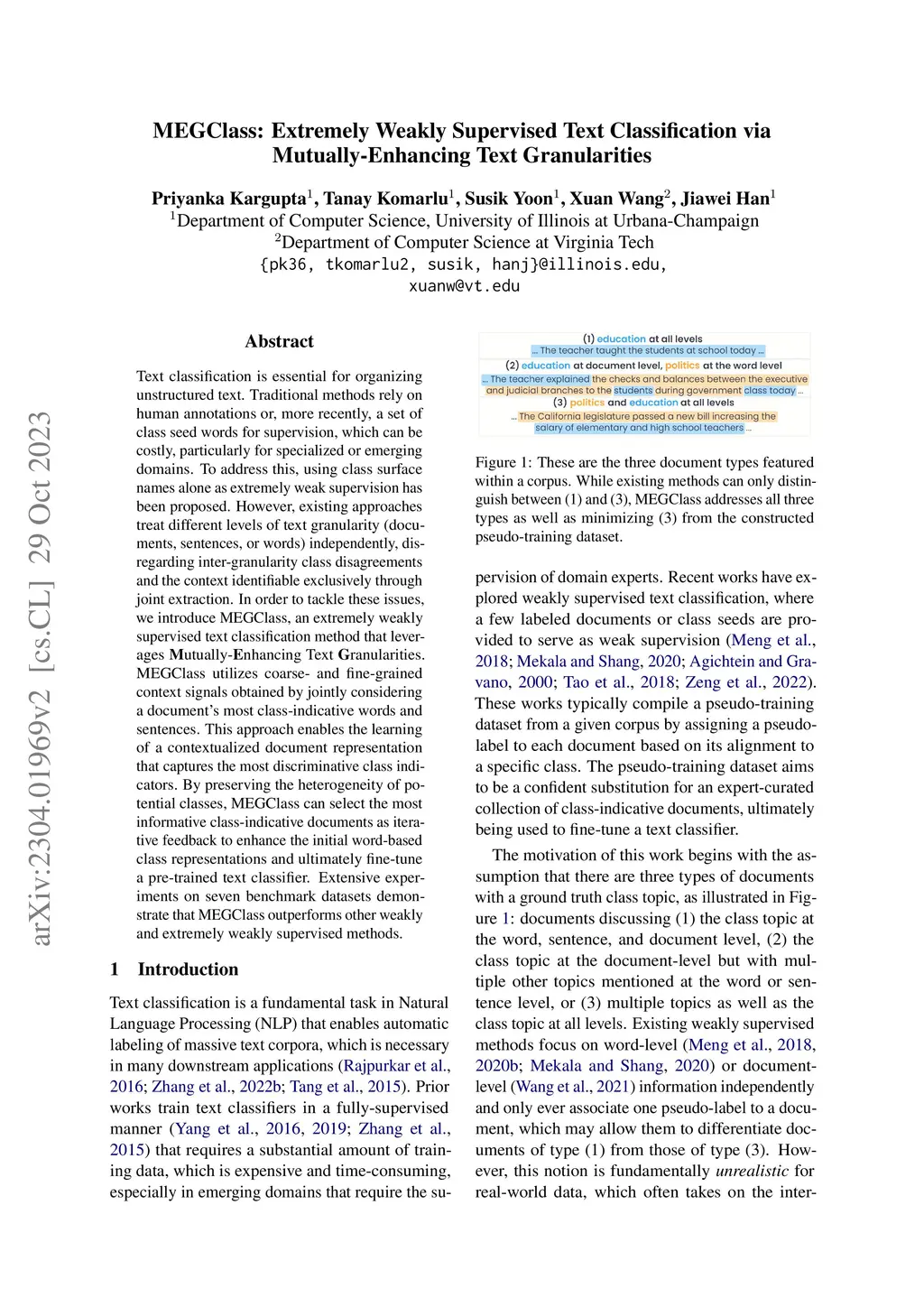 MEGClass: Extremely Weakly Supervised Text Classification via