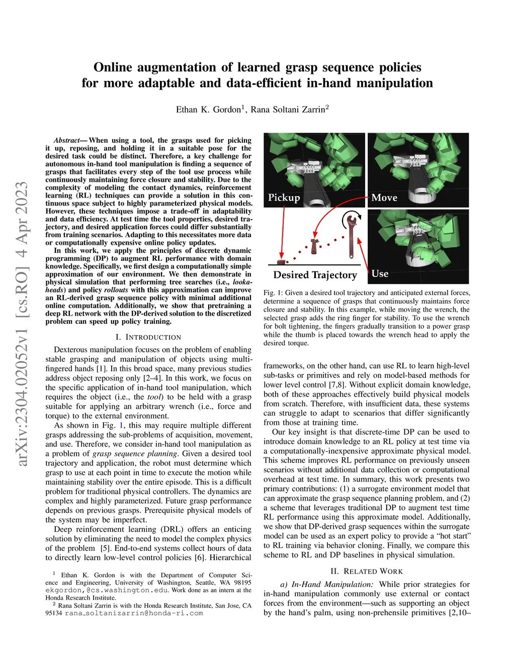 When using a tool, the grasps used for picking it up, reposing, and holding it in a suitable pose for the desired task could be distinct. Therefore, a key challenge for autonomous in-hand tool manipulation is finding a sequence of grasps that facilitates every step of the tool use process while continuously maintaining force closure and stability. Due to the complexity of modeling the contact dynamics, reinforcement learning (RL) techniques can provide a solution in this continuous space subject to highly parameterized physical models. However, these techniques impose a trade-off in adaptability and data efficiency. At test time the tool properties, desired trajectory, and desired application forces could differ substantially from training scenarios. Adapting to this necessitates more data or computationally expensive online policy updates. In this work, we apply the principles of discrete dynamic programming (DP) to augment RL performance with domain knowledge. Specifically, we first design a computationally simple approximation of our environment. We then demonstrate in physical simulation that performing tree searches (i.e., lookaheads) and policy rollouts with this approximation can improve an RL-derived grasp sequence policy with minimal additional online computation. Additionally, we show that pretraining a deep RL network with the DP-derived solution to the discretized problem can speed up policy training.