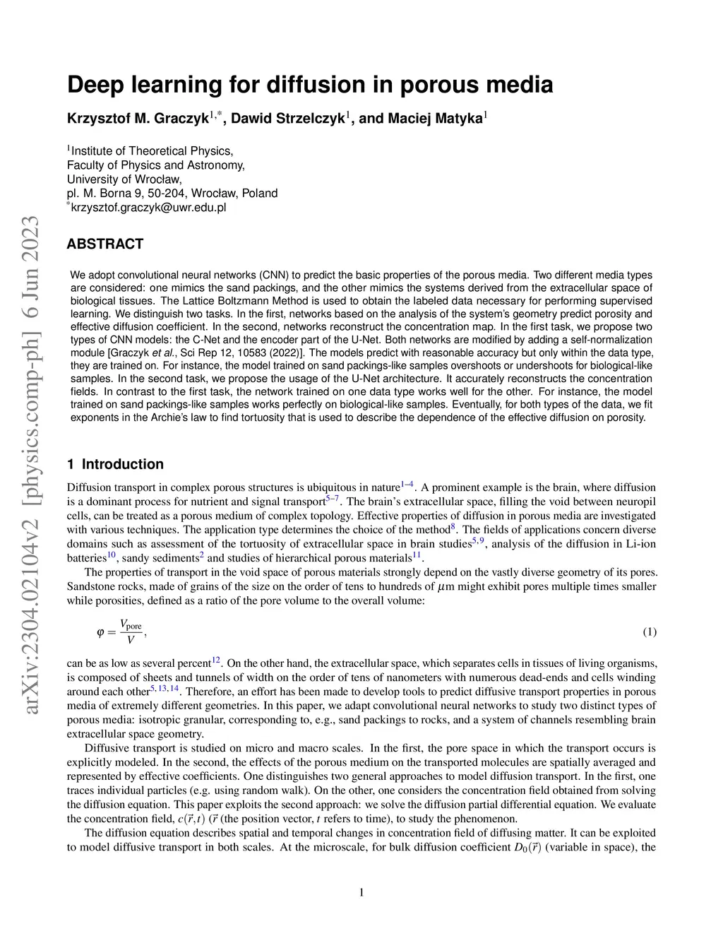 We adopt convolutional neural networks (CNN) to predict the basic properties of the porous media. Two different media types are considered: one mimics the sand packings, and the other mimics the systems derived from the extracellular space of biological tissues. The Lattice Boltzmann Method is used to obtain the labeled data necessary for performing supervised learning. We distinguish two tasks. In the first, networks based on the analysis of the system's geometry predict porosity and effective diffusion coefficient. In the second, networks reconstruct the concentration map. In the first task, we propose two types of CNN models: the C-Net and the encoder part of the U-Net. Both networks are modified by adding a self-normalization module [Graczyk \textit{et al.}, Sci Rep 12, 10583 (2022)]. The models predict with reasonable accuracy but only within the data type, they are trained on. For instance, the model trained on sand packings-like samples overshoots or undershoots for biological-like samples. In the second task, we propose the usage of the U-Net architecture. It accurately reconstructs the concentration fields. In contrast to the first task, the network trained on one data type works well for the other. For instance, the model trained on sand packings-like samples works perfectly on biological-like samples. Eventually, for both types of the data, we fit exponents in the Archie's law to find tortuosity that is used to describe the dependence of the effective diffusion on porosity.