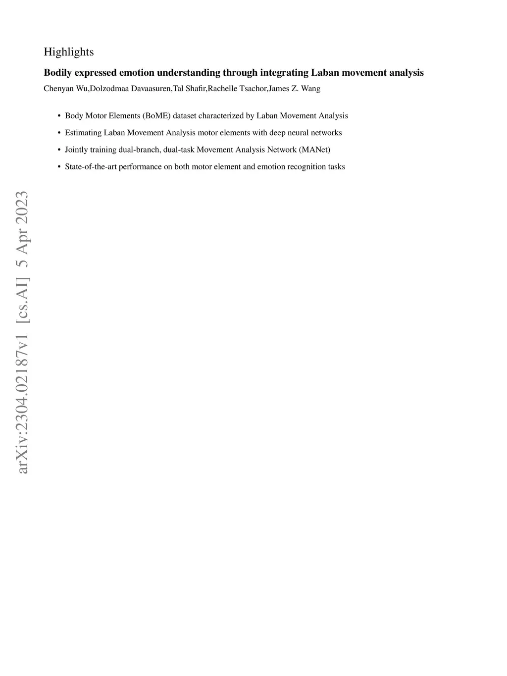 Body movements carry important information about a person's emotions or mental state and are essential in daily communication. Enhancing the ability of machines to understand emotions expressed through body language can improve the communication of assistive robots with children and elderly users, provide psychiatric professionals with quantitative diagnostic and prognostic assistance, and aid law enforcement in identifying deception. This study develops a high-quality human motor element dataset based on the Laban Movement Analysis movement coding system and utilizes that to jointly learn about motor elements and emotions. Our long-term ambition is to integrate knowledge from computing, psychology, and performing arts to enable automated understanding and analysis of emotion and mental state through body language. This work serves as a launchpad for further research into recognizing emotions through analysis of human movement.