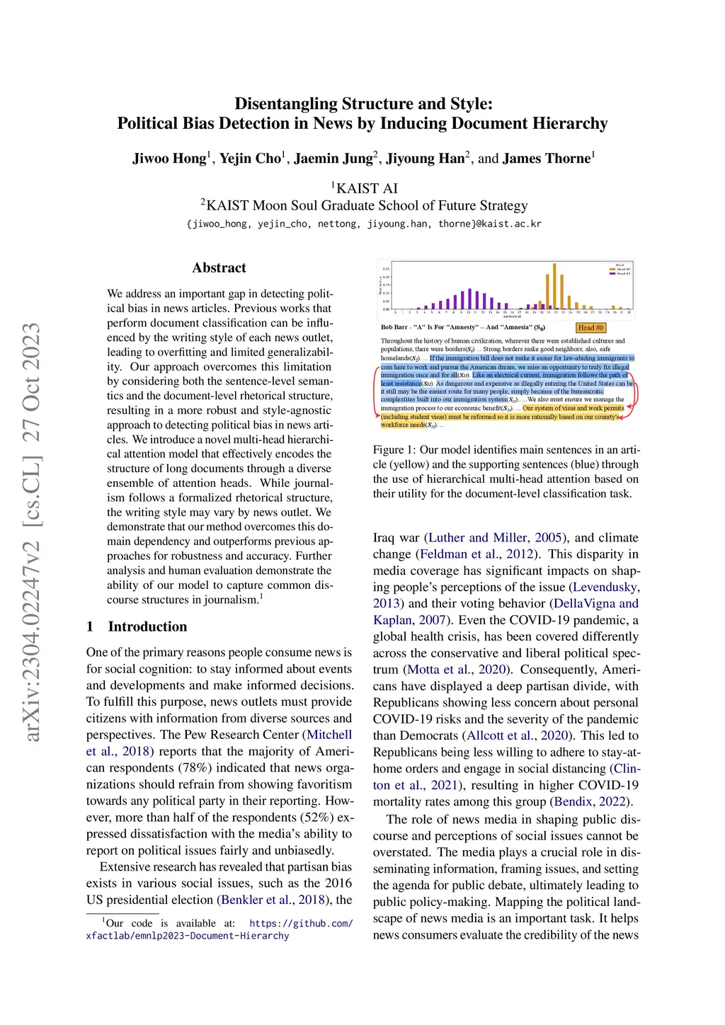 We address an important gap in detecting political bias in news articles. Previous works that perform document classification can be influenced by the writing style of each news outlet, leading to overfitting and limited generalizability. Our approach overcomes this limitation by considering both the sentence-level semantics and the document-level rhetorical structure, resulting in a more robust and style-agnostic approach to detecting political bias in news articles. We introduce a novel multi-head hierarchical attention model that effectively encodes the structure of long documents through a diverse ensemble of attention heads. While journalism follows a formalized rhetorical structure, the writing style may vary by news outlet. We demonstrate that our method overcomes this domain dependency and outperforms previous approaches for robustness and accuracy. Further analysis and human evaluation demonstrate the ability of our model to capture common discourse structures in journalism. Our code is available at: https://github.com/xfactlab/emnlp2023-Document-Hierarchy