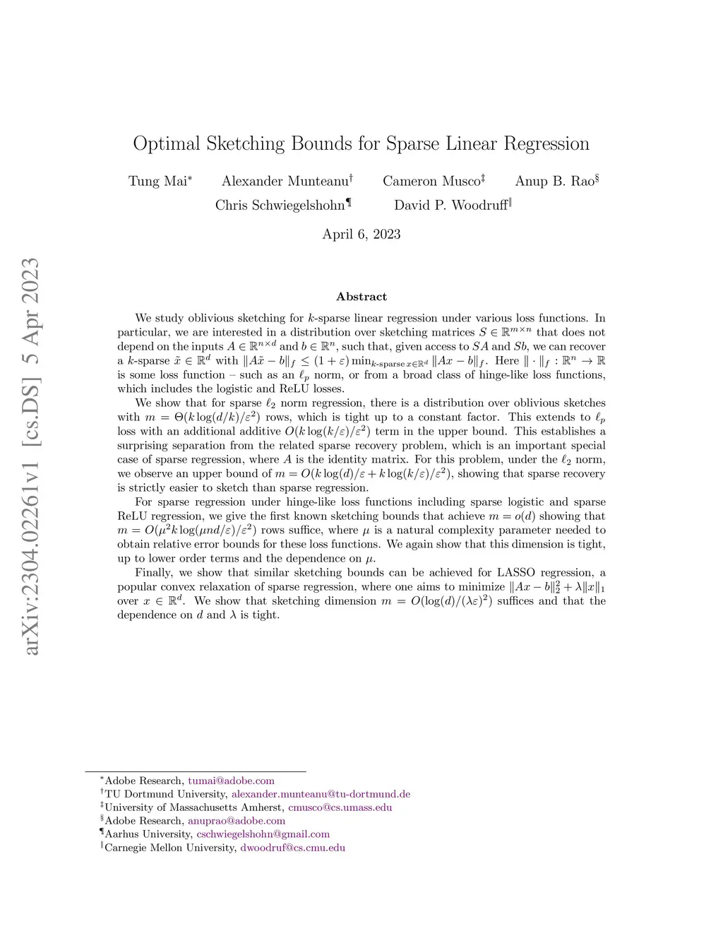 Optimal Sketching Bounds for Sparse Linear Regression