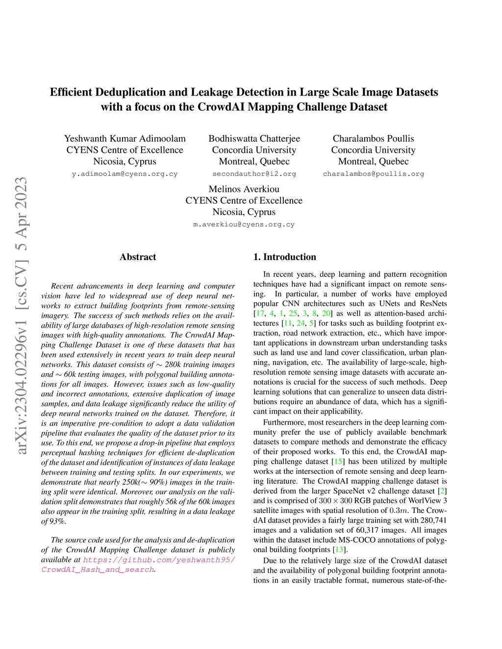 This dataset consists of $ \sim\ $280k training images and $ \sim\ 60ktestingimages,withpolygonalbuildingannotationsforallimages.However,issuessuchaslow−qualityandincorrectannotations,extensiveduplicationofimagesamples,anddataleakagesignificantlyreducetheutilityofdeepneuralnetworkstrainedonthedataset.Therefore,itisanimperativepre−conditiontoadoptadatavalidationpipelinethatevaluatesthequalityofthedatasetpriortoitsuse.Tothisend,weproposeadrop−inpipelinethatemploysperceptualhashingtechniquesforefficientde−duplicationofthedatasetandidentificationofinstancesofdataleakagebetweentrainingandtestingsplits.Inourexperiments,wedemonstratethatnearly250k( \sim\ $90%)