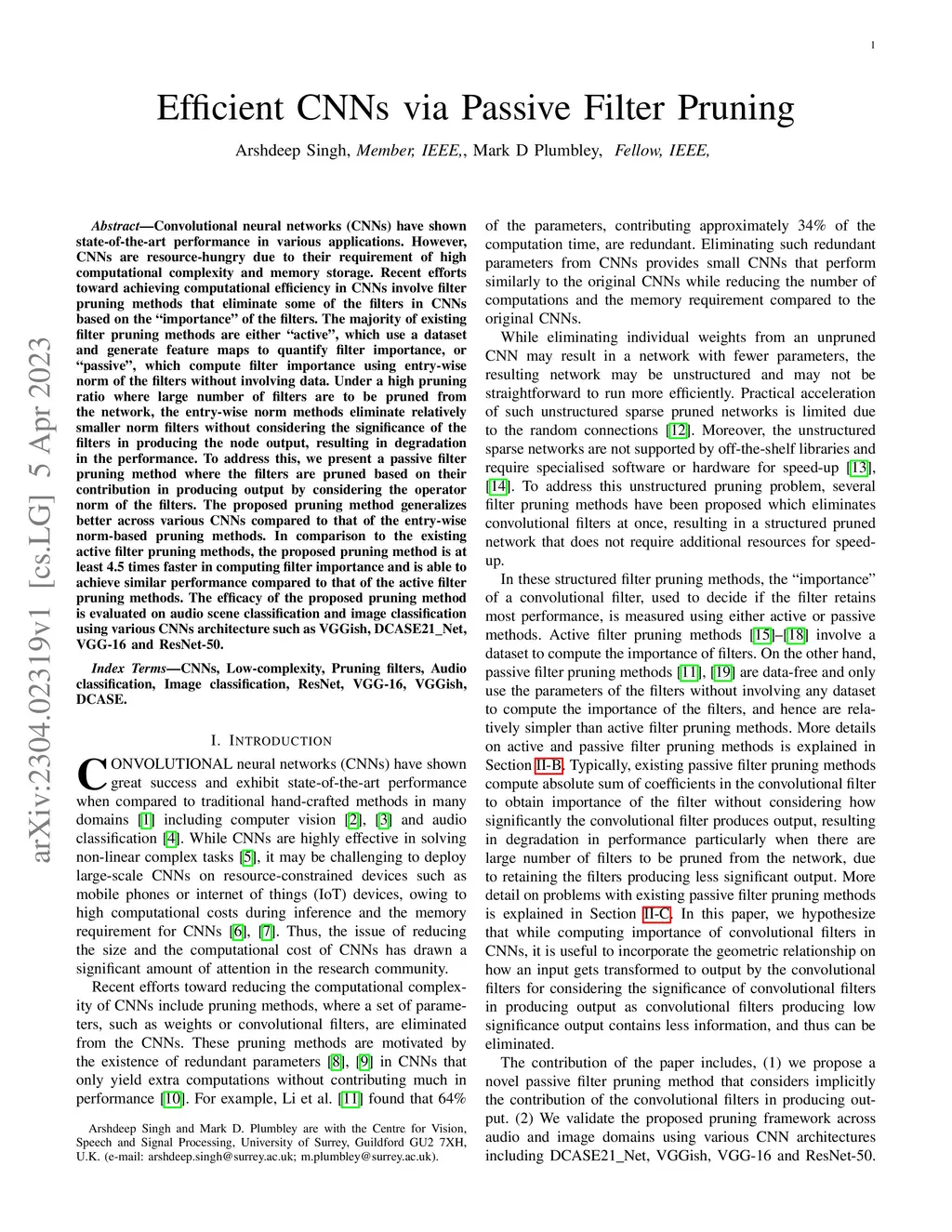Convolutional neural networks (CNNs) have shown state-of-the-art performance in various applications. However, CNNs are resource-hungry due to their requirement of high computational complexity and memory storage. Recent efforts toward achieving computational efficiency in CNNs involve filter pruning methods that eliminate some of the filters in CNNs based on the \enquote{importance} of the filters. The majority of existing filter pruning methods are either "active", which use a dataset and generate feature maps to quantify filter importance, or "passive", which compute filter importance using entry-wise norm of the filters without involving data. Under a high pruning ratio where large number of filters are to be pruned from the network, the entry-wise norm methods eliminate relatively smaller norm filters without considering the significance of the filters in producing the node output, resulting in degradation in the performance. To address this, we present a passive filter pruning method where the filters are pruned based on their contribution in producing output by considering the operator norm of the filters. The proposed pruning method generalizes better across various CNNs compared to that of the entry-wise norm-based pruning methods. In comparison to the existing active filter pruning methods, the proposed pruning method is at least 4.5 times faster in computing filter importance and is able to achieve similar performance compared to that of the active filter pruning methods. The efficacy of the proposed pruning method is evaluated on audio scene classification and image classification using various CNNs architecture such as VGGish, DCASE21_Net, VGG-16 and ResNet-50.