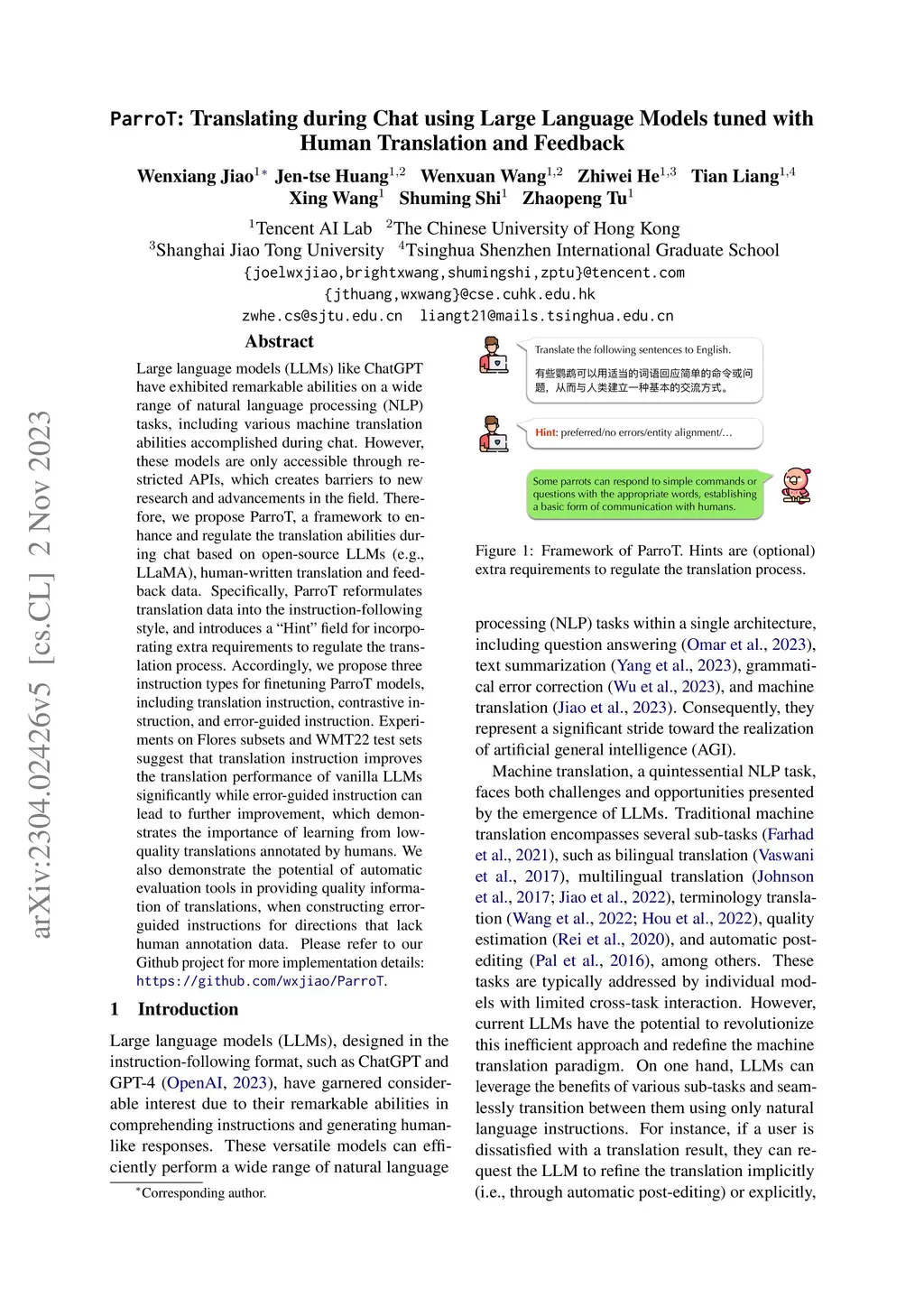 Large language models (LLMs) like ChatGPT have exhibited remarkable abilities on a wide range of natural language processing~(NLP) tasks, including various machine translation abilities accomplished during chat. However, these models are only accessible through restricted APIs, which creates barriers to new research and advancements in the field. Therefore, we propose ParroT, a framework to enhance and regulate the translation abilities during chat based on open-source LLMs (e.g., LLaMA), human-written translation and feedback data. Specifically, ParroT reformulates translation data into the instruction-following style, and introduces a "" field for incorporating extra requirements to regulate the translation process. Accordingly, we propose three instruction types for finetuning ParroT models, including translation instruction, contrastive instruction, and error-guided instruction. Experiments on Flores subsets and WMT22 test sets suggest that translation instruction improves the translation performance of vanilla LLMs significantly while error-guided instruction can lead to further improvement, which demonstrates the importance of learning from low-quality translations annotated by humans. We also demonstrate the potential of automatic evaluation tools in providing quality information of translations, when constructing error-guided instructions for directions that lack human annotation data. Please refer to our Github project for more implementation details: https://github.com/wxjiao/ParroT