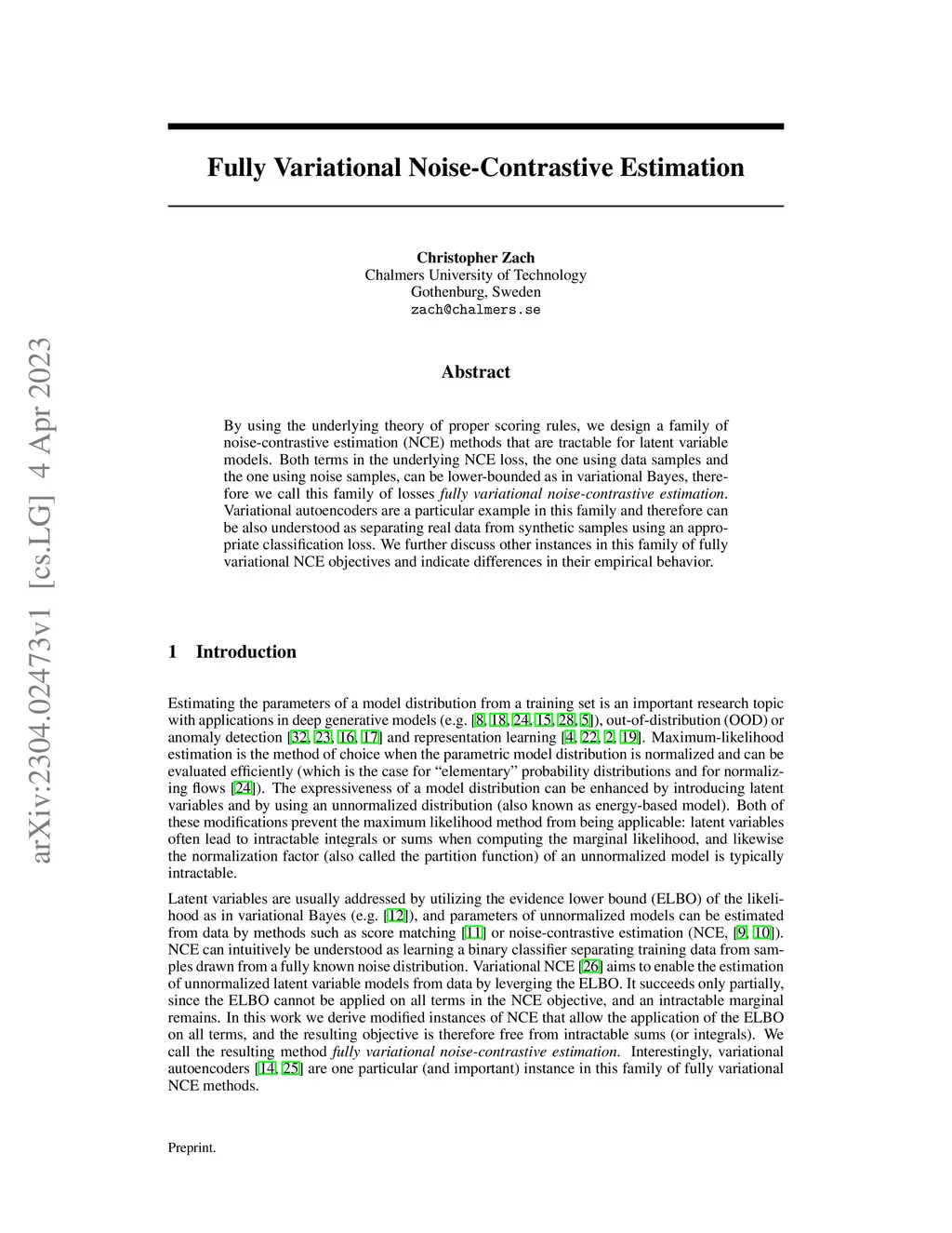 By using the underlying theory of proper scoring rules, we design a family of noise-contrastive estimation (NCE) methods that are tractable for latent variable models. Both terms in the underlying NCE loss, the one using data samples and the one using noise samples, can be lower-bounded as in variational Bayes, therefore we call this family of losses fully variational noise-contrastive estimation. Variational autoencoders are a particular example in this family and therefore can be also understood as separating real data from synthetic samples using an appropriate classification loss. We further discuss other instances in this family of fully variational NCE objectives and indicate differences in their empirical behavior.