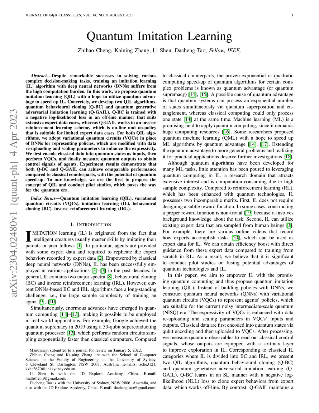 Despite remarkable successes in solving various complex decision-making tasks, training an imitation learning (IL) algorithm with deep neural networks (DNNs) suffers from the high computation burden. In this work, we propose quantum imitation learning (QIL) with a hope to utilize quantum advantage to speed up IL. Concretely, we develop two QIL algorithms, quantum behavioural cloning (Q-BC) and quantum generative adversarial imitation learning (Q-GAIL). Q-BC is trained with a negative log-likelihood loss in an off-line manner that suits extensive expert data cases, whereas Q-GAIL works in an inverse reinforcement learning scheme, which is on-line and on-policy that is suitable for limited expert data cases. For both QIL algorithms, we adopt variational quantum circuits (VQCs) in place of DNNs for representing policies, which are modified with data re-uploading and scaling parameters to enhance the expressivity. We first encode classical data into quantum states as inputs, then perform VQCs, and finally measure quantum outputs to obtain control signals of agents. Experiment results demonstrate that both Q-BC and Q-GAIL can achieve comparable performance compared to classical counterparts, with the potential of quantum speed-up. To our knowledge, we are the first to propose the concept of QIL and conduct pilot studies, which paves the way for the quantum era.