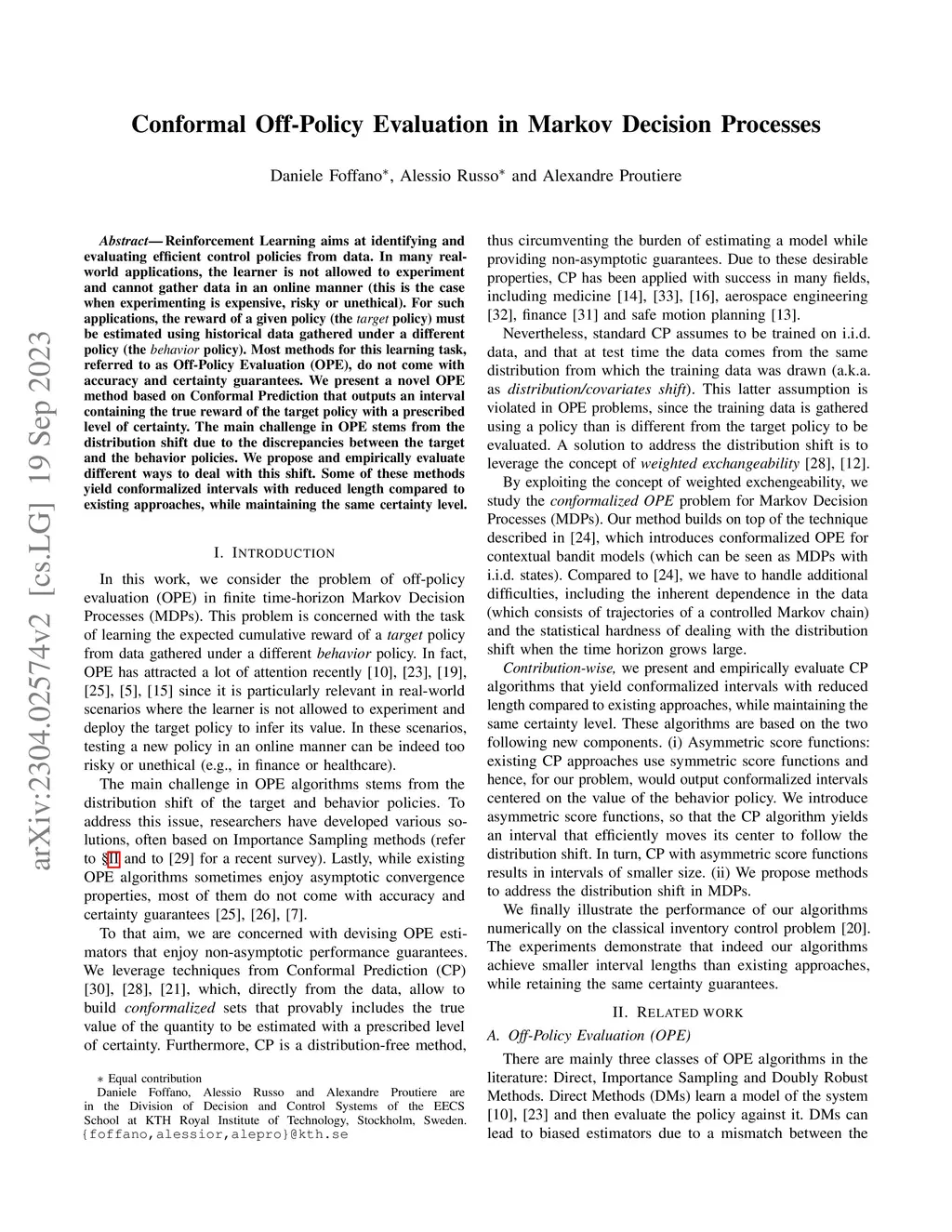 Reinforcement Learning aims at identifying and evaluating efficient control policies from data. In many real-world applications, the learner is not allowed to experiment and cannot gather data in an online manner (this is the case when experimenting is expensive, risky or unethical). For such applications, the reward of a given policy (the target policy) must be estimated using historical data gathered under a different policy (the behavior policy). Most methods for this learning task, referred to as Off-Policy Evaluation (OPE), do not come with accuracy and certainty guarantees. We present a novel OPE method based on Conformal Prediction that outputs an interval containing the true reward of the target policy with a prescribed level of certainty. The main challenge in OPE stems from the distribution shift due to the discrepancies between the target and the behavior policies. We propose and empirically evaluate different ways to deal with this shift. Some of these methods yield conformalized intervals with reduced length compared to existing approaches, while maintaining the same certainty level.