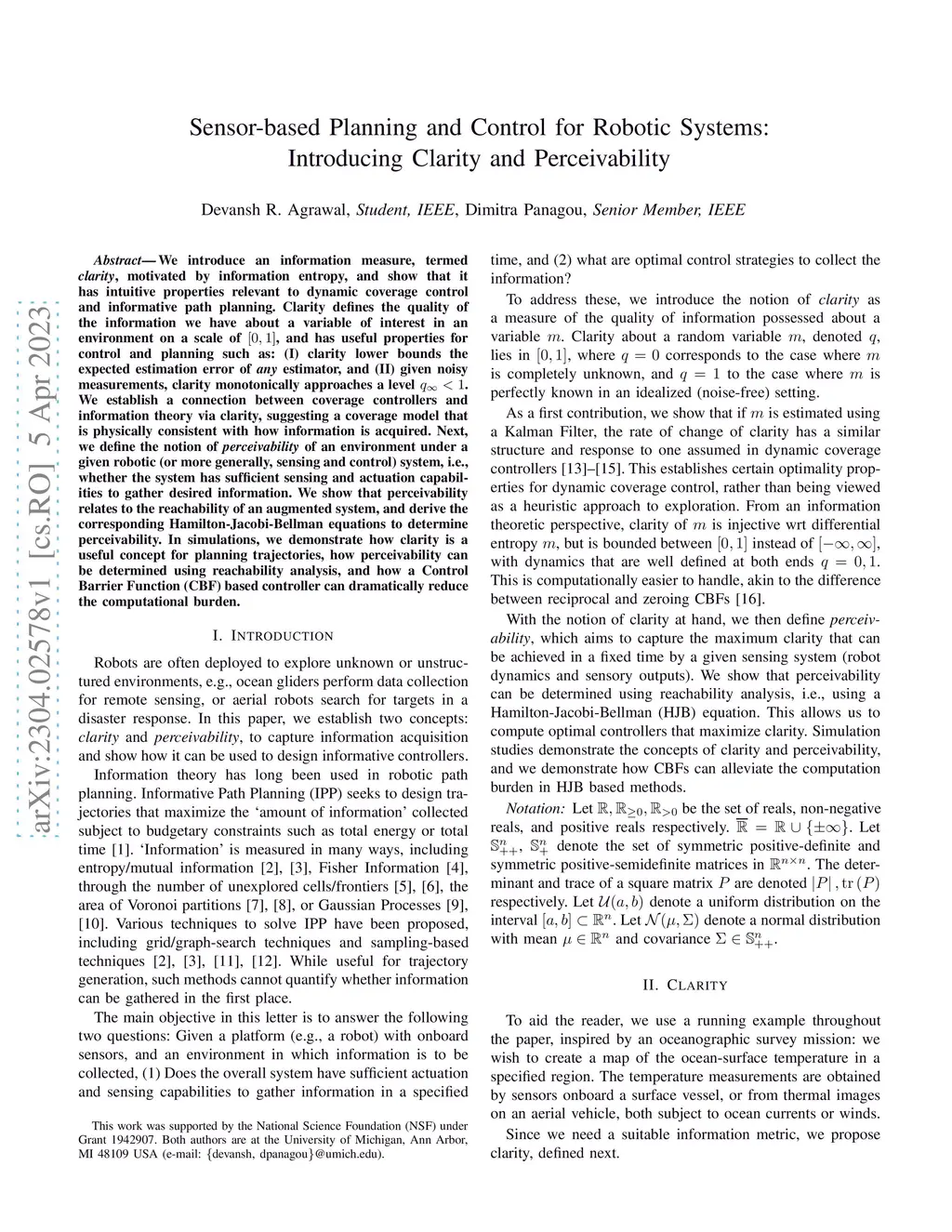 We introduce an information measure, termed clarity, motivated by information entropy, and show that it has intuitive properties relevant to dynamic coverage control and informative path planning. Clarity defines the quality of the information we have about a variable of interest in an environment on a scale of [0, 1], and has useful properties for control and planning such as: (I) clarity lower bounds the expected estimation error of any estimator, and (II) given noisy measurements, clarity monotonically approaches a level q_infty < 1. We establish a connection between coverage controllers and information theory via clarity, suggesting a coverage model that is physically consistent with how information is acquired. Next, we define the notion of perceivability of an environment under a given robotic (or more generally, sensing and control) system, i.e., whether the system has sufficient sensing and actuation capabilities to gather desired information. We show that perceivability relates to the reachability of an augmented system, and derive the corresponding Hamilton-Jacobi-Bellman equations to determine perceivability. In simulations, we demonstrate how clarity is a useful concept for planning trajectories, how perceivability can be determined using reachability analysis, and how a Control Barrier Function (CBF) based controller can dramatically reduce the computational burden.