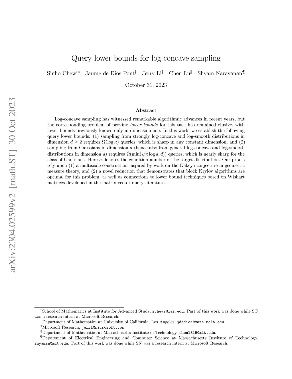 Log-concave sampling has witnessed remarkable algorithmic advances in recent years, but the corresponding problem of proving lower bounds for this task has remained elusive, with lower bounds previously known only in dimension one. In this work, we establish the following query lower bounds: (1) sampling from strongly log-concave and log-smooth distributions in dimension requires queries, which is sharp in any constant dimension, and (2) sampling from Gaussians in dimension (hence also from general log-concave and log-smooth distributions in dimension ) requires queries, which is nearly sharp for the class of Gaussians. Here denotes the condition number of the target distribution. Our proofs rely upon (1) a multiscale construction inspired by work on the Kakeya conjecture in geometric measure theory, and (2) a novel reduction that demonstrates that block Krylov algorithms are optimal for this problem, as well as connections to lower bound techniques based on Wishart matrices developed in the matrix-vector query literature.