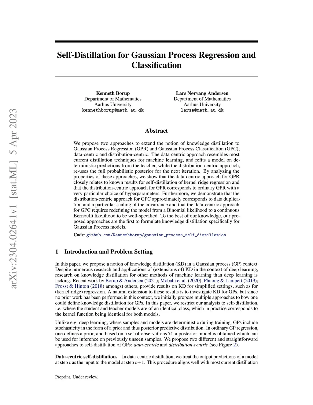We propose two approaches to extend the notion of knowledge distillation to Gaussian Process Regression (GPR) and Gaussian Process Classification (GPC); data-centric and distribution-centric. The data-centric approach resembles most current distillation techniques for machine learning, and refits a model on deterministic predictions from the teacher, while the distribution-centric approach, re-uses the full probabilistic posterior for the next iteration. By analyzing the properties of these approaches, we show that the data-centric approach for GPR closely relates to known results for self-distillation of kernel ridge regression and that the distribution-centric approach for GPR corresponds to ordinary GPR with a very particular choice of hyperparameters. Furthermore, we demonstrate that the distribution-centric approach for GPC approximately corresponds to data duplication and a particular scaling of the covariance and that the data-centric approach for GPC requires redefining the model from a Binomial likelihood to a continuous Bernoulli likelihood to be well-specified. To the best of our knowledge, our proposed approaches are the first to formulate knowledge distillation specifically for Gaussian Process models.