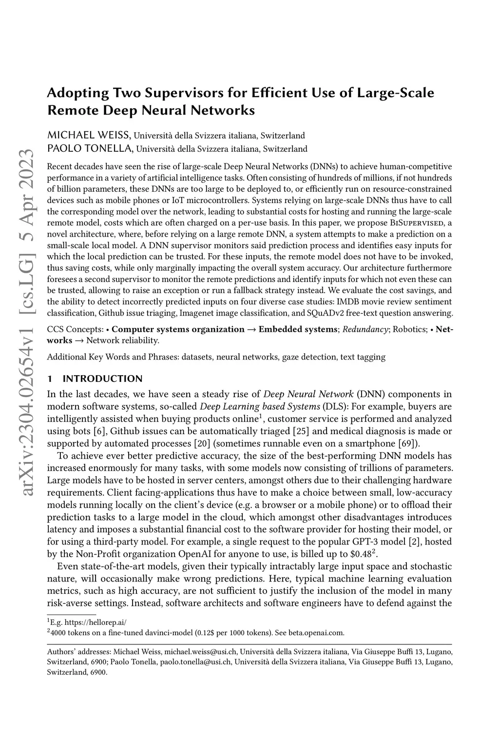 Recent decades have seen the rise of large-scale Deep Neural Networks (DNNs) to achieve human-competitive performance in a variety of artificial intelligence tasks. Often consisting of hundreds of millions, if not hundreds of billion parameters, these DNNs are too large to be deployed to, or efficiently run on resource-constrained devices such as mobile phones or IoT microcontrollers. Systems relying on large-scale DNNs thus have to call the corresponding model over the network, leading to substantial costs for hosting and running the large-scale remote model, costs which are often charged on a per-use basis. In this paper, we propose BiSupervised, a novel architecture, where, before relying on a large remote DNN, a system attempts to make a prediction on a small-scale local model. A DNN supervisor monitors said prediction process and identifies easy inputs for which the local prediction can be trusted. For these inputs, the remote model does not have to be invoked, thus saving costs, while only marginally impacting the overall system accuracy. Our architecture furthermore foresees a second supervisor to monitor the remote predictions and identify inputs for which not even these can be trusted, allowing to raise an exception or run a fallback strategy instead. We evaluate the cost savings, and the ability to detect incorrectly predicted inputs on four diverse case studies: IMDB movie review sentiment classification, Github issue triaging, Imagenet image classification, and SQuADv2 free-text question answering