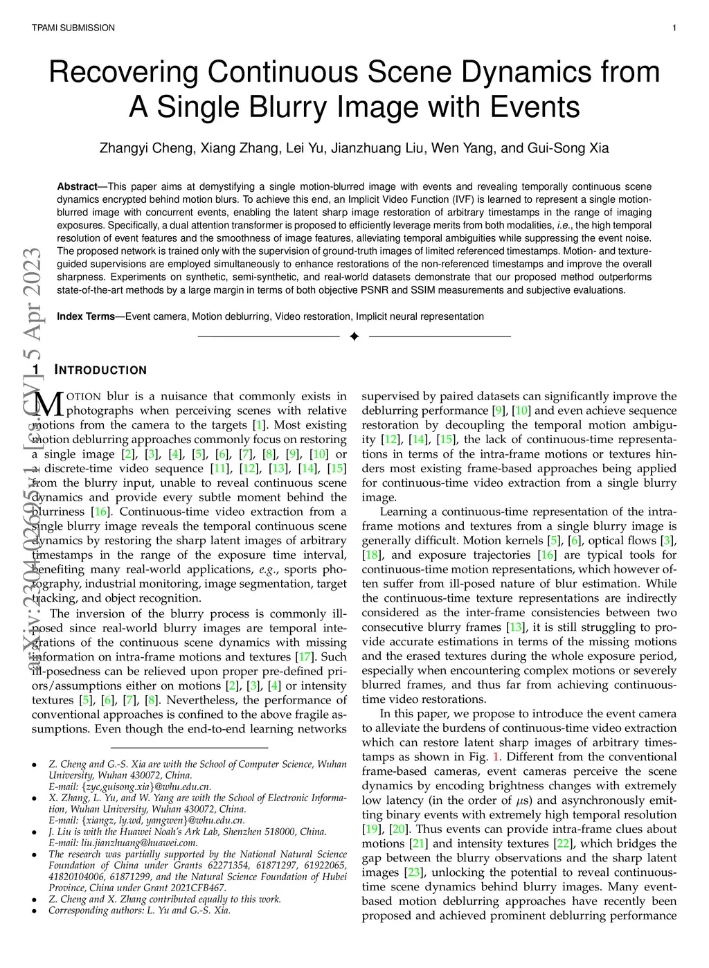 This paper aims at demystifying a single motion-blurred image with events and revealing temporally continuous scene dynamics encrypted behind motion blurs. To achieve this end, an Implicit Video Function (IVF) is learned to represent a single motion blurred image with concurrent events, enabling the latent sharp image restoration of arbitrary timestamps in the range of imaging exposures. Specifically, a dual attention transformer is proposed to efficiently leverage merits from both modalities, i.e., the high temporal resolution of event features and the smoothness of image features, alleviating temporal ambiguities while suppressing the event noise. The proposed network is trained only with the supervision of ground-truth images of limited referenced timestamps. Motion- and texture-guided supervisions are employed simultaneously to enhance restorations of the non-referenced timestamps and improve the overall sharpness. Experiments on synthetic, semi-synthetic, and real-world datasets demonstrate that our proposed method outperforms state-of-the-art methods by a large margin in terms of both objective PSNR and SSIM measurements and subjective evaluations.