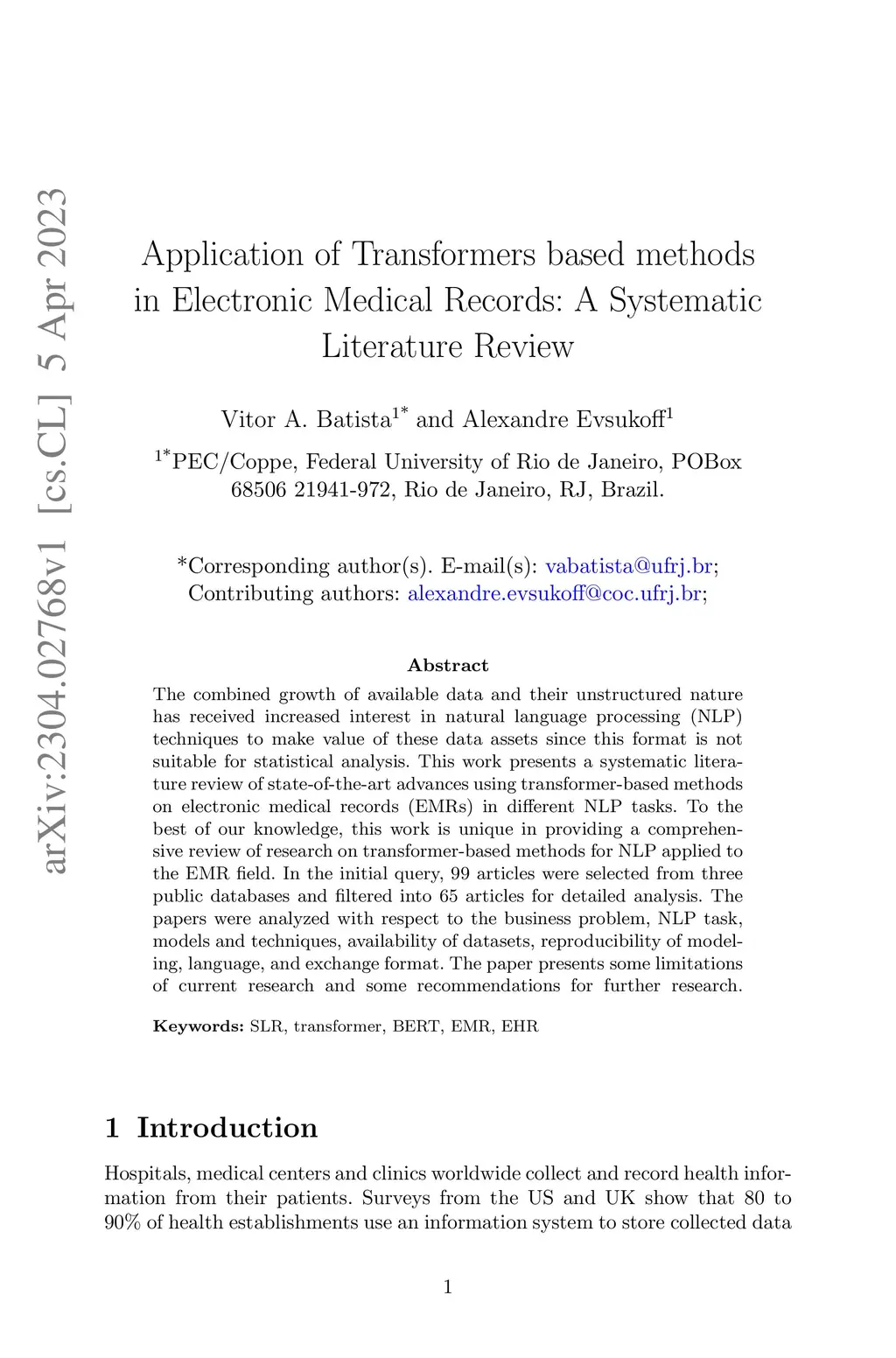 Application of Transformers based methods in Electronic Medical Records: