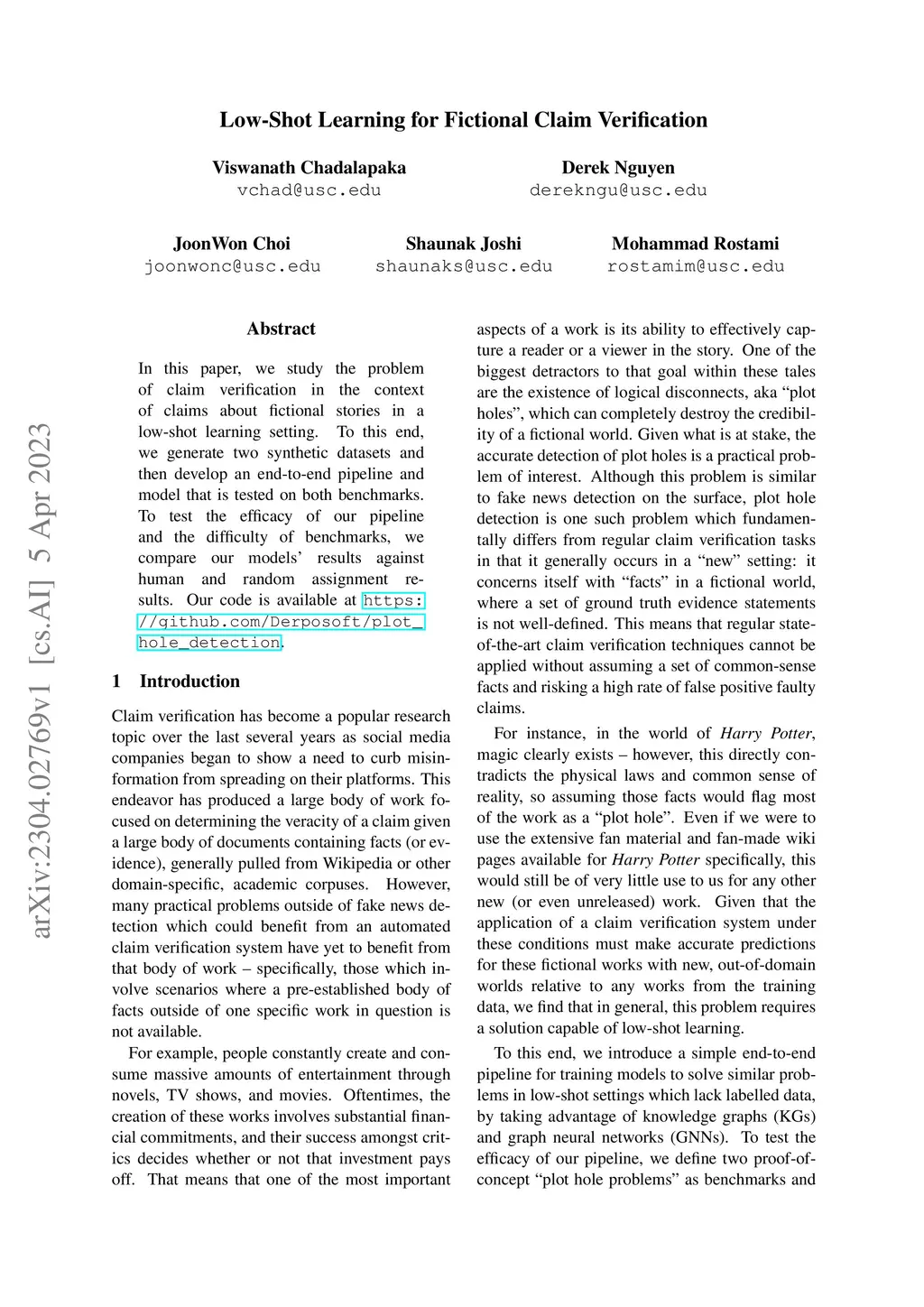 In this paper, we study the problem of claim verification in the context of claims about fictional stories in a low-shot learning setting. To this end, we generate two synthetic datasets and then develop an end-to-end pipeline and model that is tested on both benchmarks. To test the efficacy of our pipeline and the difficulty of benchmarks, we compare our models' results against human and random assignment results. Our code is available at https://github.com/Derposoft/plot_hole_detection.