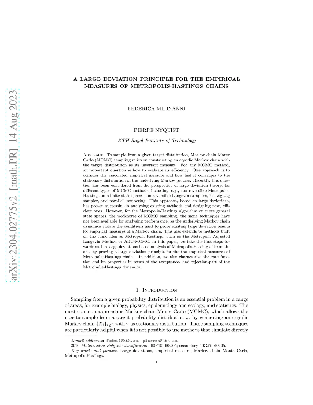 To sample from a given target distribution, Markov chain Monte Carlo (MCMC) sampling relies on constructing an ergodic Markov chain with the target distribution as its invariant measure. For any MCMC method, an important question is how to evaluate its efficiency. One approach is to consider the associated empirical measure and how fast it converges to the stationary distribution of the underlying Markov process. Recently, this question has been considered from the perspective of large deviation theory, for different types of MCMC methods, including, e.g., non-reversible Metropolis-Hastings on a finite state space, non-reversible Langevin samplers, the zig-zag sampler, and parallell tempering. This approach, based on large deviations, has proven successful in analysing existing methods and designing new, efficient ones. However, for the Metropolis-Hastings algorithm on more general state spaces, the workhorse of MCMC sampling, the same techniques have not been available for analysing performance, as the underlying Markov chain dynamics violate the conditions used to prove existing large deviation results for empirical measures of a Markov chain. This also extends to methods built on the same idea as Metropolis-Hastings, such as the Metropolis-Adjusted Langevin Method or ABC-MCMC. In this paper, we take the first steps towards such a large-deviations based analysis of Metropolis-Hastings-like methods, by proving a large deviation principle for the the empirical measures of Metropolis-Hastings chains. In addition, we characterize the rate function and its properties in terms of the acceptance- and rejection-part of the Metropolis-Hastings dynamics.