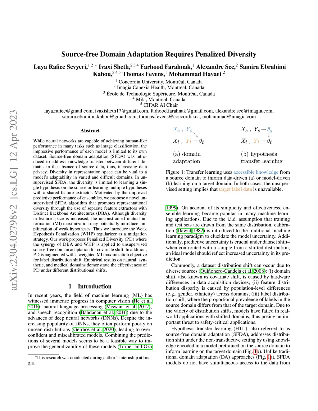 While neural networks are capable of achieving human-like performance in many tasks such as image classification, the impressive performance of each model is limited to its own dataset. Source-free domain adaptation (SFDA) was introduced to address knowledge transfer between different domains in the absence of source data, thus, increasing data privacy. Diversity in representation space can be vital to a model`s adaptability in varied and difficult domains. In unsupervised SFDA, the diversity is limited to learning a single hypothesis on the source or learning multiple hypotheses with a shared feature extractor. Motivated by the improved predictive performance of ensembles, we propose a novel unsupervised SFDA algorithm that promotes representational diversity through the use of separate feature extractors with Distinct Backbone Architectures (DBA). Although diversity in feature space is increased, the unconstrained mutual information (MI) maximization may potentially introduce amplification of weak hypotheses. Thus we introduce the Weak Hypothesis Penalization (WHP) regularizer as a mitigation strategy. Our work proposes Penalized Diversity (PD) where the synergy of DBA and WHP is applied to unsupervised source-free domain adaptation for covariate shift. In addition, PD is augmented with a weighted MI maximization objective for label distribution shift. Empirical results on natural, synthetic, and medical domains demonstrate the effectiveness of PD under different distributional shifts.