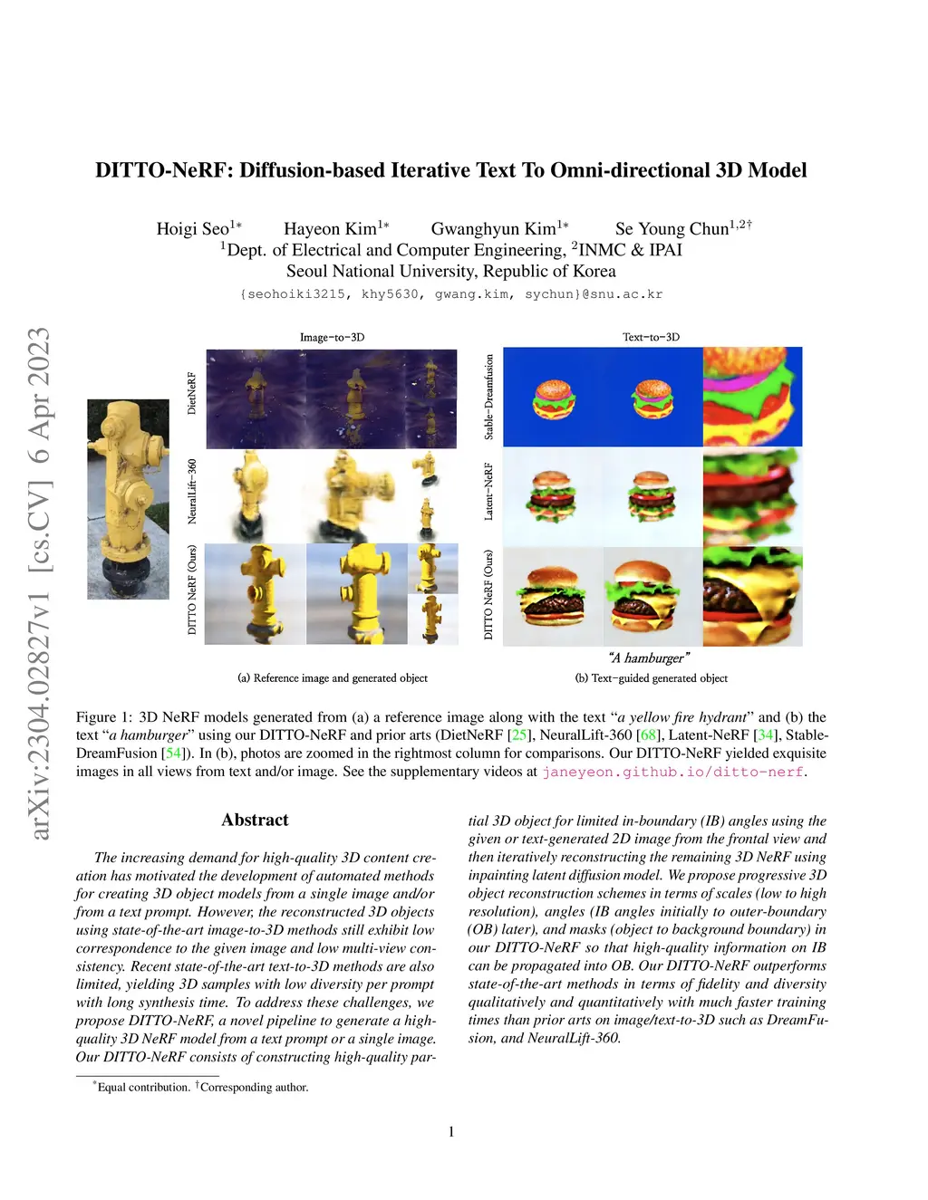 The increasing demand for high-quality 3D content creation has motivated the development of automated methods for creating 3D object models from a single image and/or from a text prompt. However, the reconstructed 3D objects using state-of-the-art image-to-3D methods still exhibit low correspondence to the given image and low multi-view consistency. Recent state-of-the-art text-to-3D methods are also limited, yielding 3D samples with low diversity per prompt with long synthesis time. To address these challenges, we propose DITTO-NeRF, a novel pipeline to generate a high-quality 3D NeRF model from a text prompt or a single image. Our DITTO-NeRF consists of constructing high-quality partial 3D object for limited in-boundary (IB) angles using the given or text-generated 2D image from the frontal view and then iteratively reconstructing the remaining 3D NeRF using inpainting latent diffusion model. We propose progressive 3D object reconstruction schemes in terms of scales (low to high resolution), angles (IB angles initially to outer-boundary (OB) later), and masks (object to background boundary) in our DITTO-NeRF so that high-quality information on IB can be propagated into OB. Our DITTO-NeRF outperforms state-of-the-art methods in terms of fidelity and diversity qualitatively and quantitatively with much faster training times than prior arts on image/text-to-3D such as DreamFusion, and NeuralLift-360.