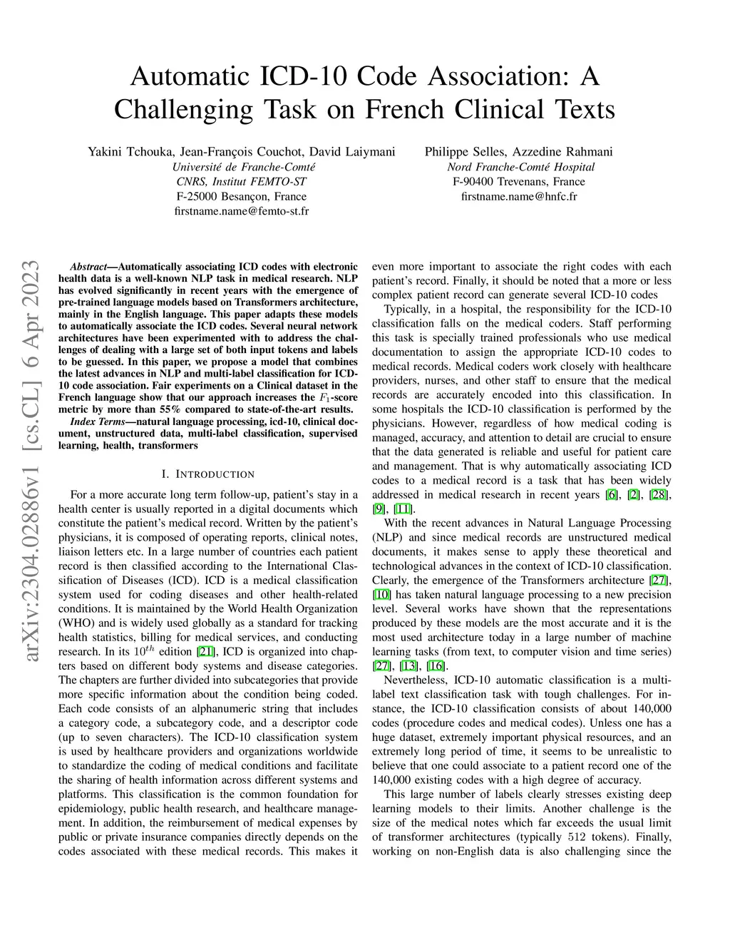 Automatically associating ICD codes with electronic health data is a well-known NLP task in medical research. NLP has evolved significantly in recent years with the emergence of pre-trained language models based on Transformers architecture, mainly in the English language. This paper adapts these models to automatically associate the ICD codes. Several neural network architectures have been experimented with to address the challenges of dealing with a large set of both input tokens and labels to be guessed. In this paper, we propose a model that combines the latest advances in NLP and multi-label classification for ICD-10 code association. Fair experiments on a Clinical dataset in the French language show that our approach increases the -score metric by more than 55\% compared to state-of-the-art results.