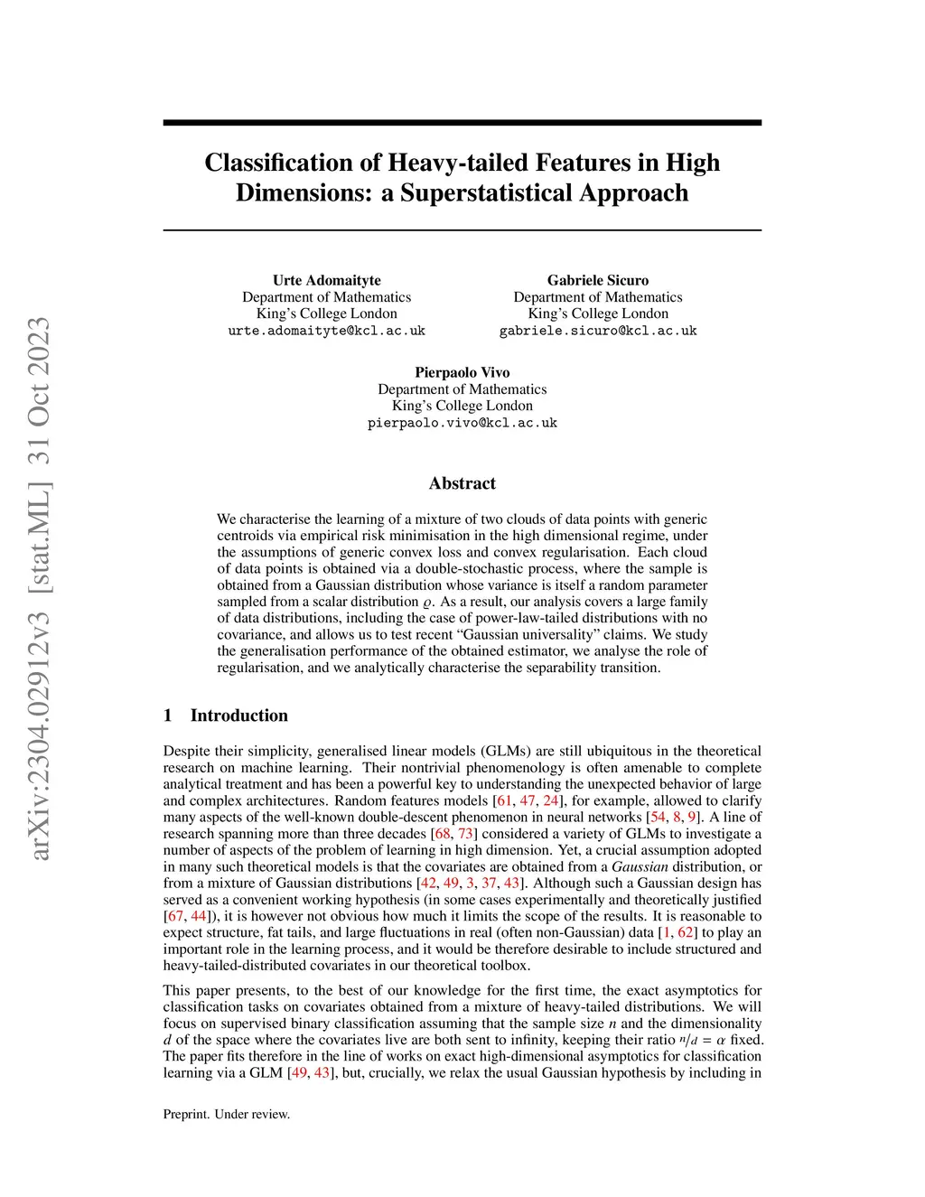 We characterise the learning of a mixture of two clouds of data points with generic centroids via empirical risk minimisation in the high dimensional regime, under the assumptions of generic convex loss and convex regularisation. Each cloud of data points is obtained by sampling from a possibly uncountable superposition of Gaussian distributions, whose variance has a generic probability density . Our analysis covers therefore a large family of data distributions, including the case of power-law-tailed distributions with no covariance. We study the generalisation performance of the obtained estimator, we analyse the role of regularisation, and the dependence of the separability transition on the distribution scale parameters.
