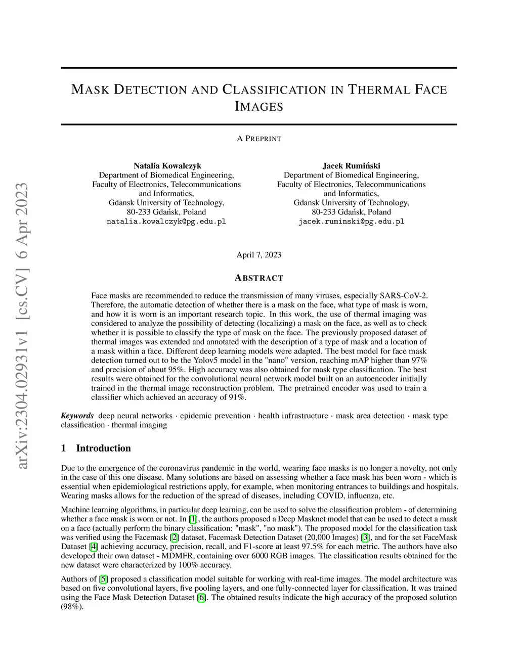 Face masks are recommended to reduce the transmission of many viruses, especially SARS-CoV-2. Therefore, the automatic detection of whether there is a mask on the face, what type of mask is worn, and how it is worn is an important research topic. In this work, the use of thermal imaging was considered to analyze the possibility of detecting (localizing) a mask on the face, as well as to check whether it is possible to classify the type of mask on the face. The previously proposed dataset of thermal images was extended and annotated with the description of a type of mask and a location of a mask within a face. Different deep learning models were adapted. The best model for face mask detection turned out to be the Yolov5 model in the "nano" version, reaching mAP higher than 97% and precision of about 95%. High accuracy was also obtained for mask type classification. The best results were obtained for the convolutional neural network model built on an autoencoder initially trained in the thermal image reconstruction problem. The pretrained encoder was used to train a classifier which achieved an accuracy of 91%.