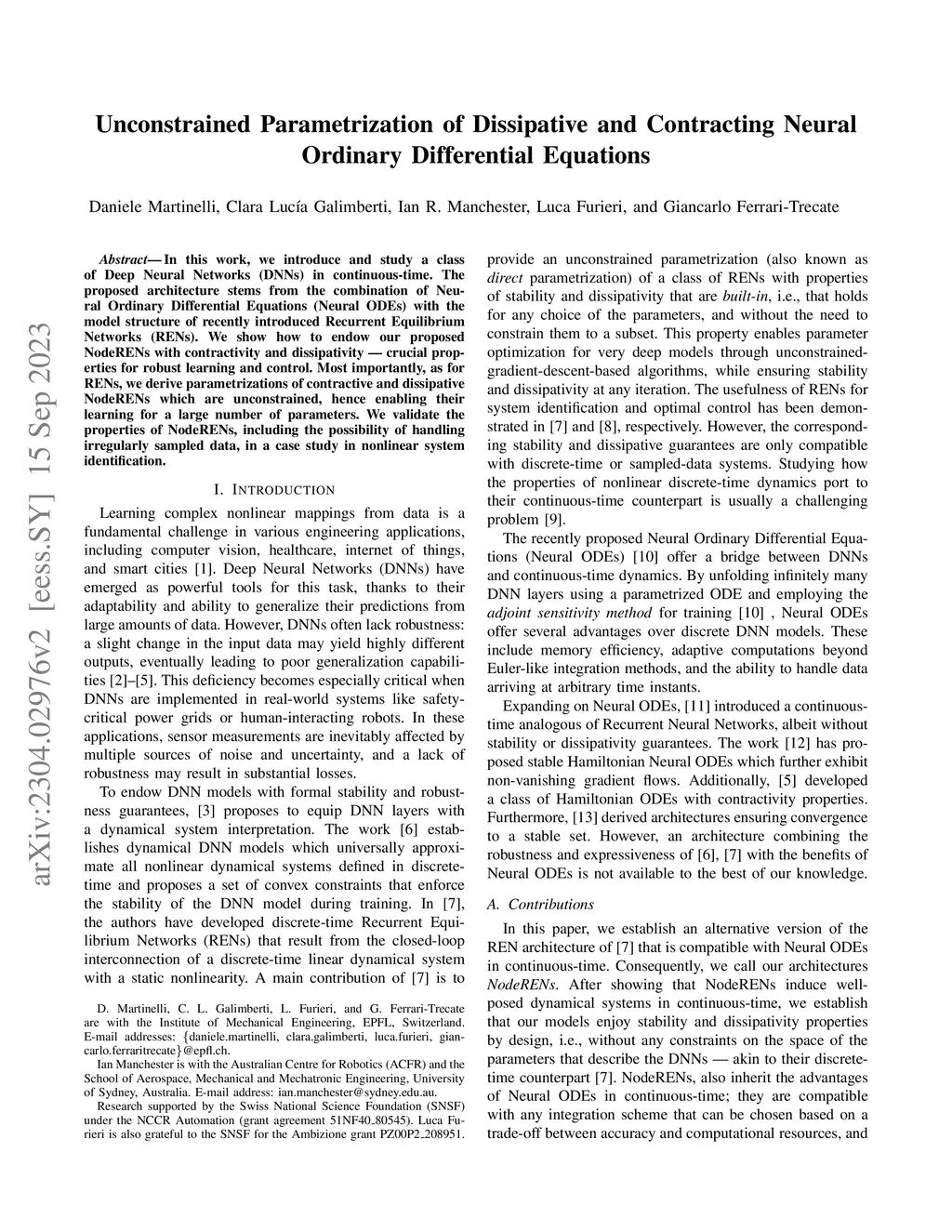 In this work, we introduce and study a class of Deep Neural Networks (DNNs) in continuous-time. The proposed architecture stems from the combination of Neural Ordinary Differential Equations (Neural ODEs) with the model structure of recently introduced Recurrent Equilibrium Networks (RENs). We show how to endow our proposed NodeRENs with contractivity and dissipativity -- crucial properties for robust learning and control. Most importantly, as for RENs, we derive parametrizations of contractive and dissipative NodeRENs which are unconstrained, hence enabling their learning for a large number of parameters. We validate the properties of NodeRENs, including the possibility of handling irregularly sampled data, in a case study in nonlinear system identification.