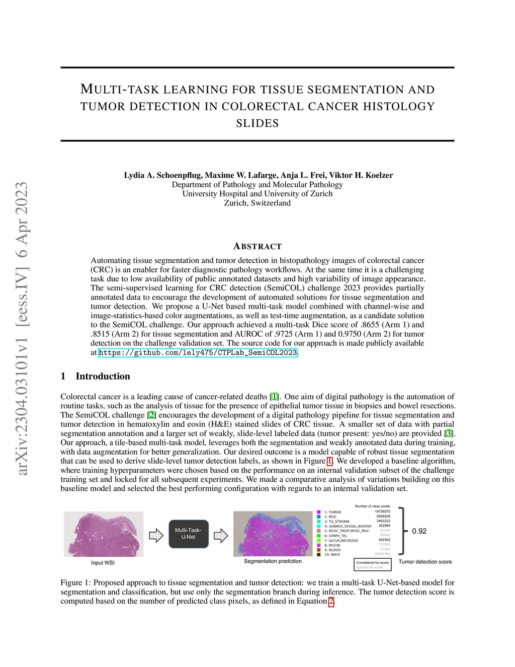 Automating tissue segmentation and tumor detection in histopathology images of colorectal cancer (CRC) is an enabler for faster diagnostic pathology workflows. At the same time it is a challenging task due to low availability of public annotated datasets and high variability of image appearance. The semi-supervised learning for CRC detection (SemiCOL) challenge 2023 provides partially annotated data to encourage the development of automated solutions for tissue segmentation and tumor detection. We propose a U-Net based multi-task model combined with channel-wise and image-statistics-based color augmentations, as well as test-time augmentation, as a candidate solution to the SemiCOL challenge. Our approach achieved a multi-task Dice score of .8655 (Arm 1) and .8515 (Arm 2) for tissue segmentation and AUROC of .9725 (Arm 1) and 0.9750 (Arm 2) for tumor detection on the challenge validation set. The source code for our approach is made publicly available at https://github.com/lely475/CTPLab_SemiCOL2023.