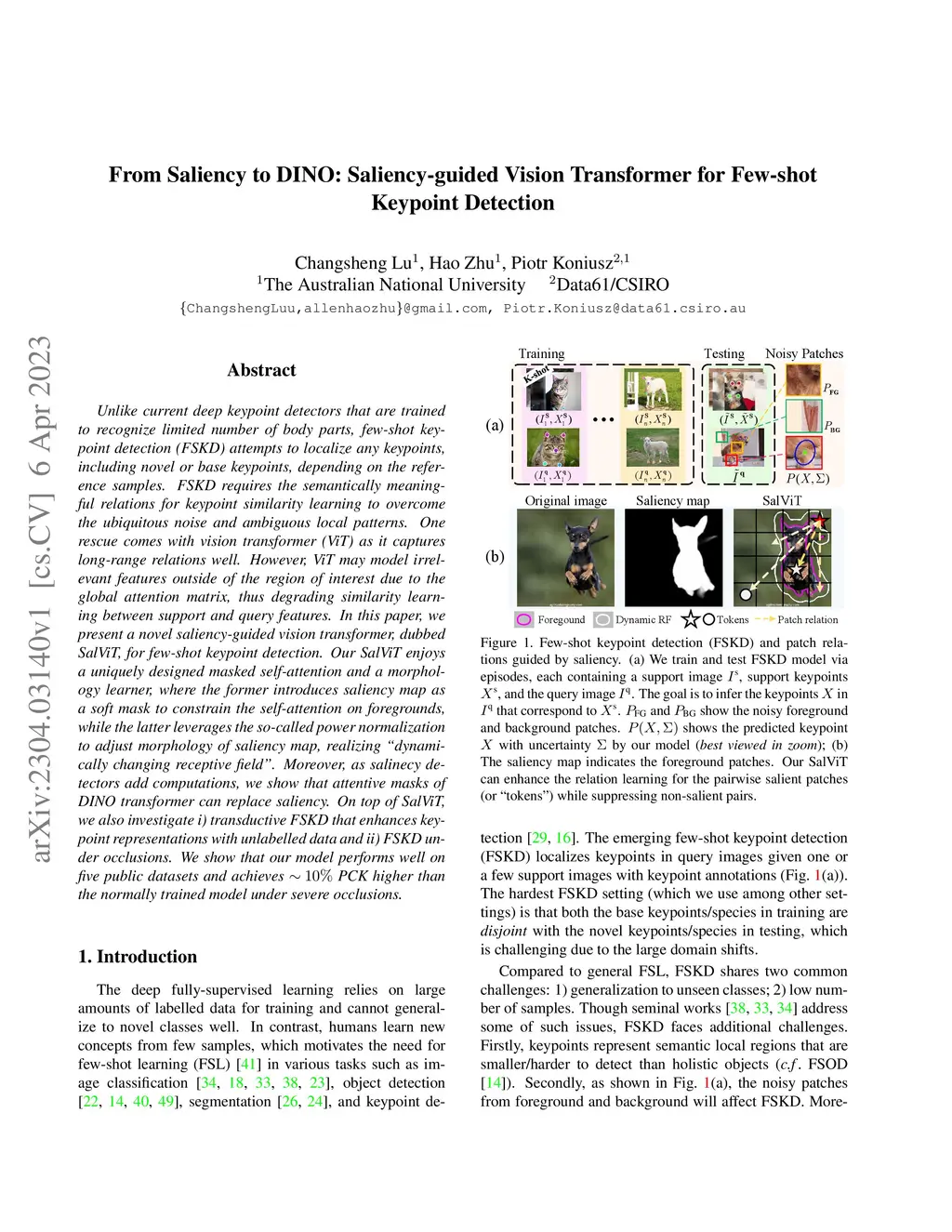 Unlike current deep keypoint detectors that are trained to recognize limited number of body parts, few-shot keypoint detection (FSKD) attempts to localize any keypoints, including novel or base keypoints, depending on the reference samples. FSKD requires the semantically meaningful relations for keypoint similarity learning to overcome the ubiquitous noise and ambiguous local patterns. One rescue comes with vision transformer (ViT) as it captures long-range relations well. However, ViT may model irrelevant features outside of the region of interest due to the global attention matrix, thus degrading similarity learning between support and query features. In this paper, we present a novel saliency-guided vision transformer, dubbed SalViT, for few-shot keypoint detection. Our SalViT enjoys a uniquely designed masked self-attention and a morphology learner, where the former introduces saliency map as a soft mask to constrain the self-attention on foregrounds, while the latter leverages the so-called power normalization to adjust morphology of saliency map, realizing ``dynamically changing receptive field''. Moreover, as salinecy detectors add computations, we show that attentive masks of DINO transformer can replace saliency. On top of SalViT, we also investigate i) transductive FSKD that enhances keypoint representations with unlabelled data and ii) FSKD under occlusions. We show that our model performs well on five public datasets and achieves ~10% PCK higher than the normally trained model under severe occlusions.