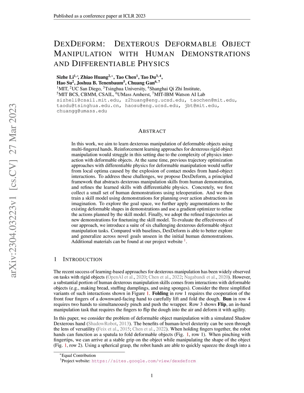 In this work, we aim to learn dexterous manipulation of deformable objects using multi-fingered hands. Reinforcement learning approaches for dexterous rigid object manipulation would struggle in this setting due to the complexity of physics interaction with deformable objects. At the same time, previous trajectory optimization approaches with differentiable physics for deformable manipulation would suffer from local optima caused by the explosion of contact modes from hand-object interactions. To address these challenges, we propose DexDeform, a principled framework that abstracts dexterous manipulation skills from human demonstration and refines the learned skills with differentiable physics. Concretely, we first collect a small set of human demonstrations using teleoperation. And we then train a skill model using demonstrations for planning over action abstractions in imagination. To explore the goal space, we further apply augmentations to the existing deformable shapes in demonstrations and use a gradient optimizer to refine the actions planned by the skill model. Finally, we adopt the refined trajectories as new demonstrations for finetuning the skill model. To evaluate the effectiveness of our approach, we introduce a suite of six challenging dexterous deformable object manipulation tasks. Compared with baselines, DexDeform is able to better explore and generalize across novel goals unseen in the initial human demonstrations.