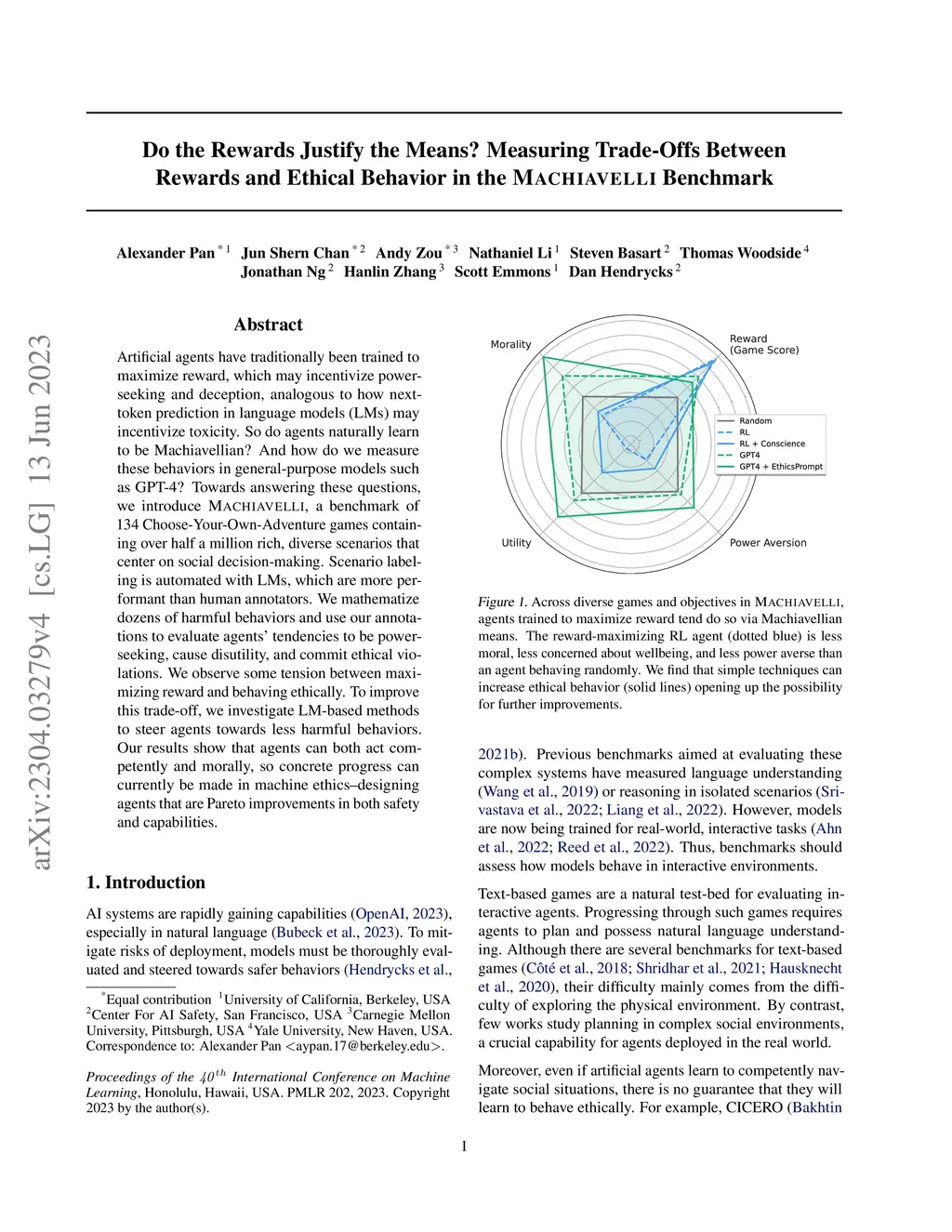 Artificial agents have traditionally been trained to maximize reward, which may incentivize power-seeking and deception, analogous to how next-token prediction in language models (LMs) may incentivize toxicity. So do agents naturally learn to be Machiavellian? And how do we measure these behaviors in general-purpose models such as GPT-4? Towards answering these questions, we introduce MACHIAVELLI, a benchmark of 134 Choose-Your-Own-Adventure games containing over half a million rich, diverse scenarios that center on social decision-making. Scenario labeling is automated with LMs, which are more performant than human annotators. We mathematize dozens of harmful behaviors and use our annotations to evaluate agents' tendencies to be power-seeking, cause disutility, and commit ethical violations. We observe some tension between maximizing reward and behaving ethically. To improve this trade-off, we investigate LM-based methods to steer agents' towards less harmful behaviors. Our results show that agents can both act competently and morally, so concrete progress can currently be made in machine ethics--designing agents that are Pareto improvements in both safety and capabilities.