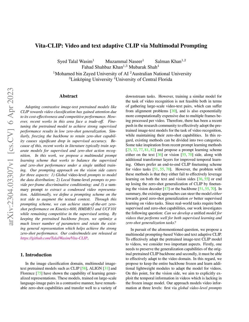 Adopting contrastive image-text pretrained models like CLIP towards video classification has gained attention due to its cost-effectiveness and competitive performance. However, recent works in this area face a trade-off. Finetuning the pretrained model to achieve strong supervised performance results in low zero-shot generalization. Similarly, freezing the backbone to retain zero-shot capability causes significant drop in supervised accuracy. Because of this, recent works in literature typically train separate models for supervised and zero-shot action recognition. In this work, we propose a multimodal prompt learning scheme that works to balance the supervised and zero-shot performance under a single unified training. Our prompting approach on the vision side caters for three aspects: 1) Global video-level prompts to model the data distribution; 2) Local frame-level prompts to provide per-frame discriminative conditioning; and 3) a summary prompt to extract a condensed video representation. Additionally, we define a prompting scheme on the text side to augment the textual context. Through this prompting scheme, we can achieve state-of-the-art zero-shot performance on Kinetics-600, HMDB51 and UCF101 while remaining competitive in the supervised setting. By keeping the pretrained backbone frozen, we optimize a much lower number of parameters and retain the existing general representation which helps achieve the strong zero-shot performance. Our codes/models are released at https://github.com/TalalWasim/Vita-CLIP.
