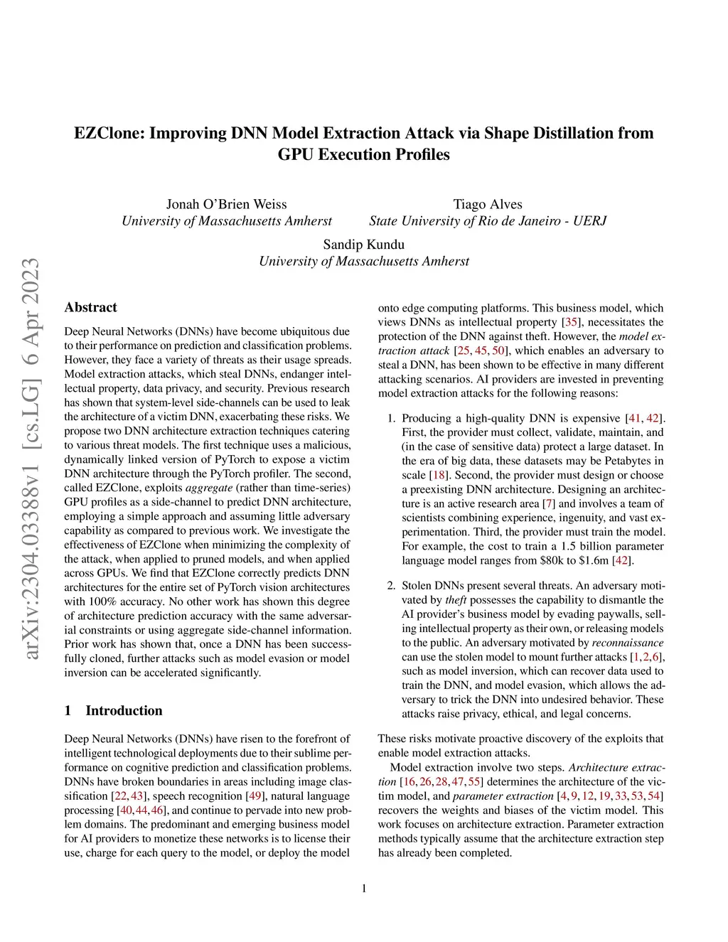 Deep Neural Networks (DNNs) have become ubiquitous due to their performance on prediction and classification problems. However, they face a variety of threats as their usage spreads. Model extraction attacks, which steal DNNs, endanger intellectual property, data privacy, and security. Previous research has shown that system-level side-channels can be used to leak the architecture of a victim DNN, exacerbating these risks. We propose two DNN architecture extraction techniques catering to various threat models. The first technique uses a malicious, dynamically linked version of PyTorch to expose a victim DNN architecture through the PyTorch profiler. The second, called EZClone, exploits aggregate (rather than time-series) GPU profiles as a side-channel to predict DNN architecture, employing a simple approach and assuming little adversary capability as compared to previous work. We investigate the effectiveness of EZClone when minimizing the complexity of the attack, when applied to pruned models, and when applied across GPUs. We find that EZClone correctly predicts DNN architectures for the entire set of PyTorch vision architectures with 100% accuracy. No other work has shown this degree of architecture prediction accuracy with the same adversarial constraints or using aggregate side-channel information. Prior work has shown that, once a DNN has been successfully cloned, further attacks such as model evasion or model inversion can be accelerated significantly.