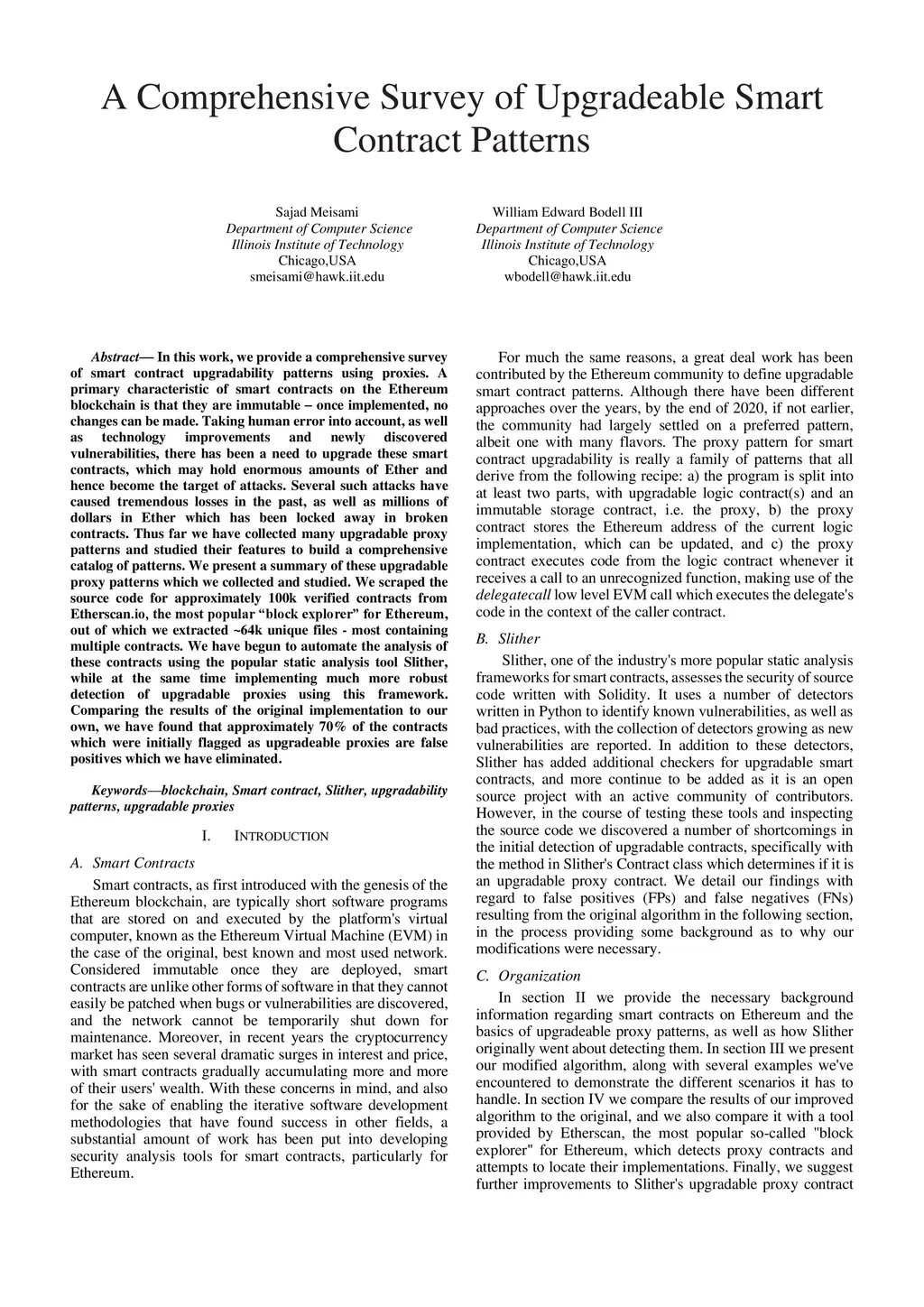In this work, we provide a comprehensive survey of smart contract upgradability patterns using proxies. A primary characteristic of smart contracts on the Ethereum blockchain is that they are immutable once implemented, no changes can be made. Taking human error into account, as well as technology improvements and newly discovered vulnerabilities, there has been a need to upgrade these smart contracts, which may hold enormous amounts of Ether and hence become the target of attacks. Several such attacks have caused tremendous losses in the past, as well as millions of dollars in Ether which has been locked away in broken contracts. Thus far we have collected many upgradable proxy patterns and studied their features to build a comprehensive catalog of patterns. We present a summary of these upgradable proxy patterns which we collected and studied. We scraped the source code for approximately 100000 verified contracts from Etherscan.io, the most popular block explorer for Ethereum, out of which we extracted around 64k unique files - most containing multiple contracts. We have begun to automate the analysis of these contracts using the popular static analysis tool Slither, while at the same time implementing much more robust detection of upgradable proxies using this framework. Comparing the results of the original implementation to our own, we have found that approximately 70 percent of the contracts which were initially flagged as upgradeable proxies are false positives which we have eliminated.