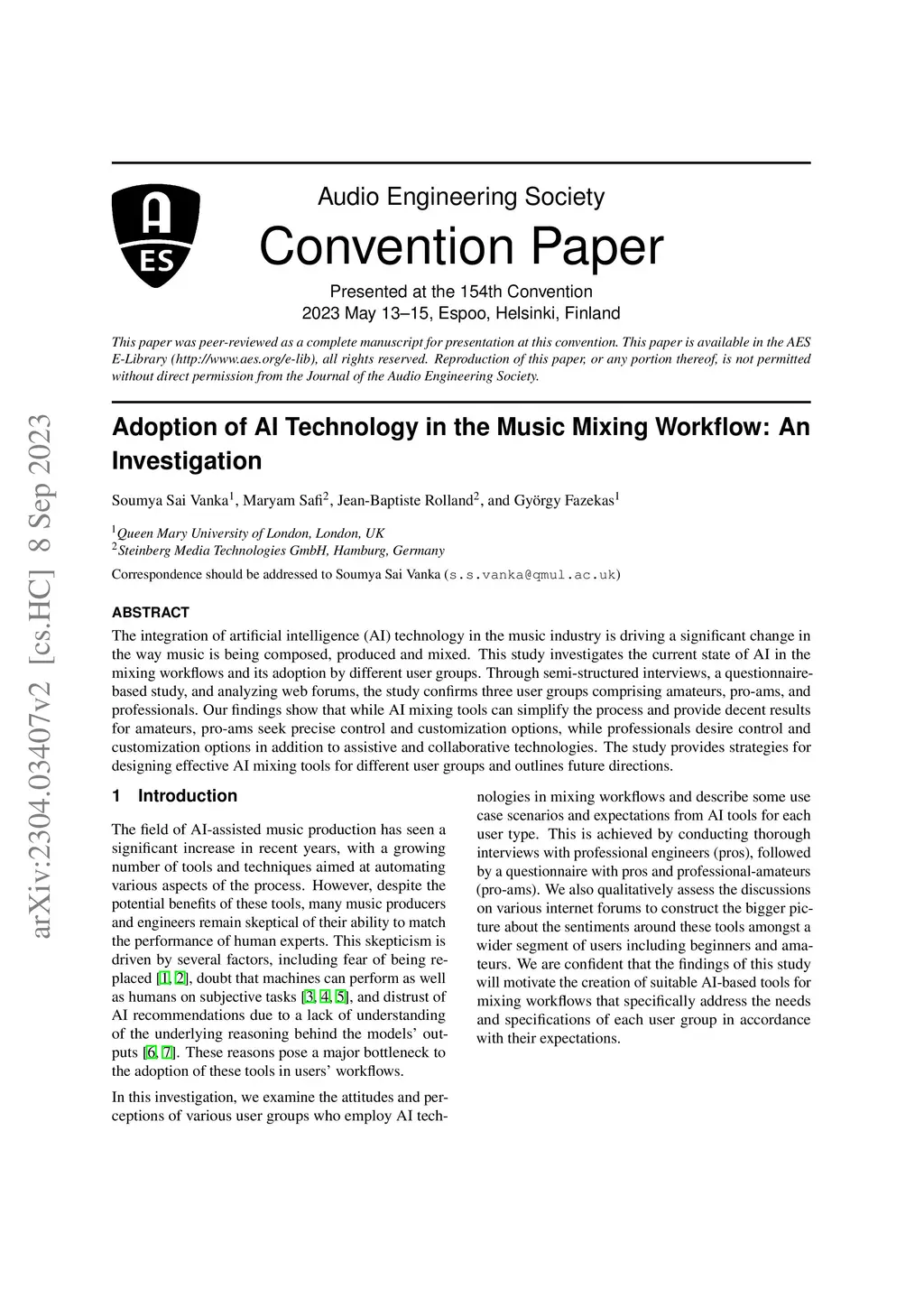 Adoption of AI Technology in the Music Mixing Workflow: An Investigation