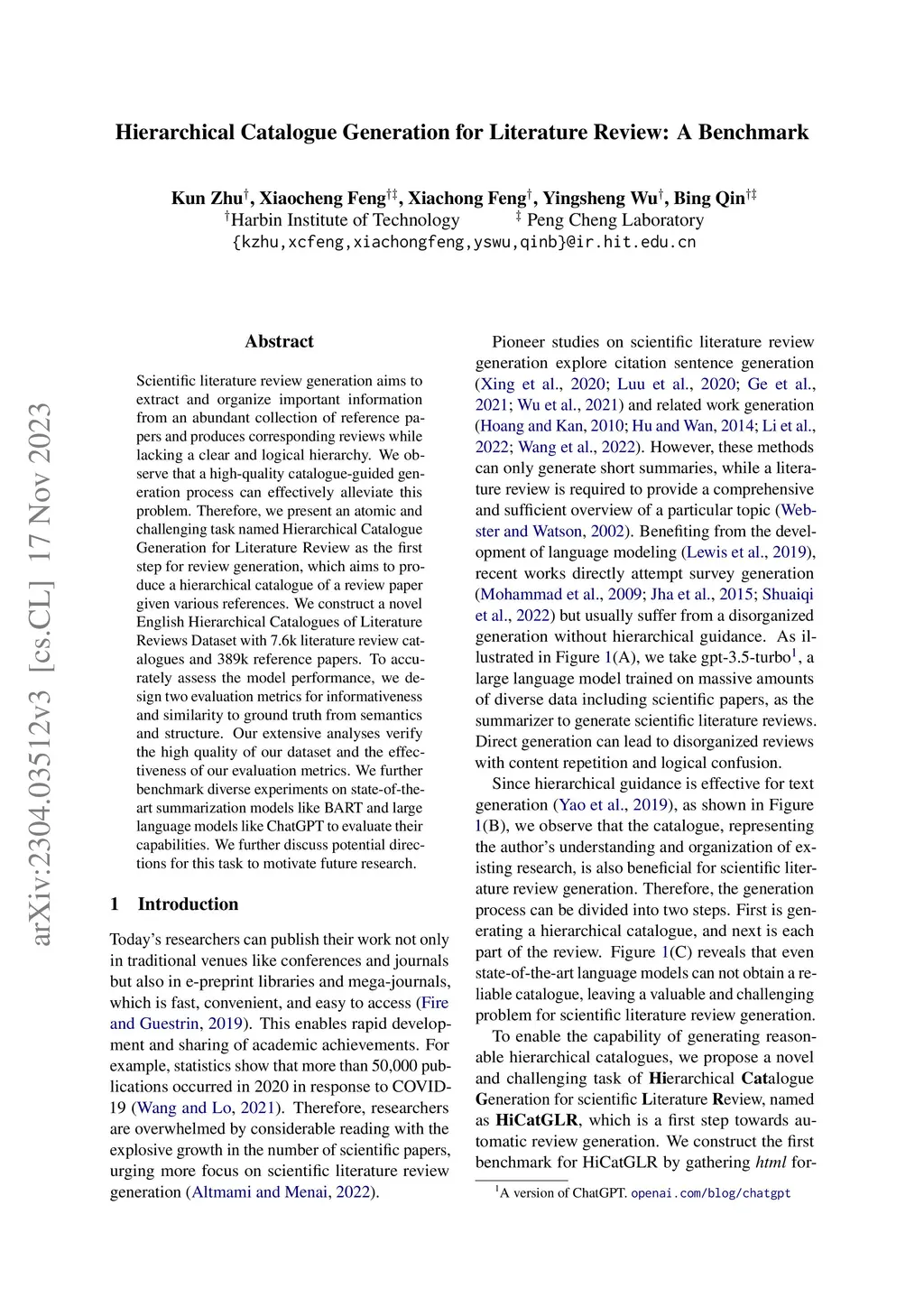 Hierarchical Catalogue Generation for Literature Review: A Benchmark