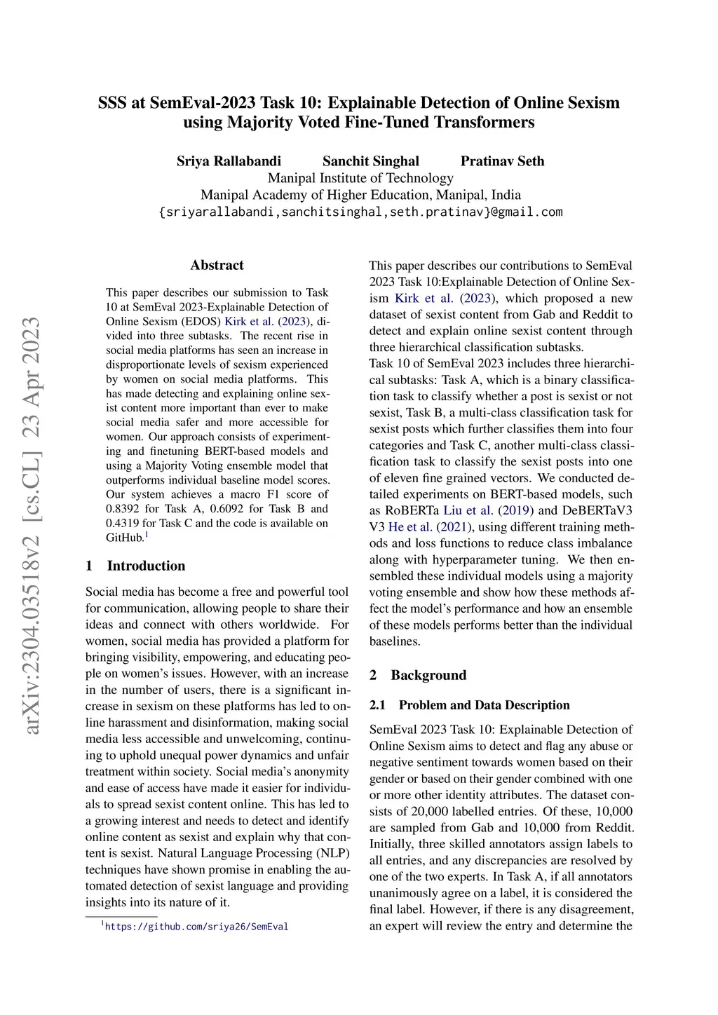 This paper describes our submission to Task 10 at SemEval 2023-Explainable Detection of Online Sexism (EDOS), divided into three subtasks. The recent rise in social media platforms has seen an increase in disproportionate levels of sexism experienced by women on social media platforms. This has made detecting and explaining online sexist content more important than ever to make social media safer and more accessible for women. Our approach consists of experimenting and finetuning BERT-based models and using a Majority Voting ensemble model that outperforms individual baseline model scores. Our system achieves a macro F1 score of 0.8392 for Task A, 0.6092 for Task B, and 0.4319 for Task C.